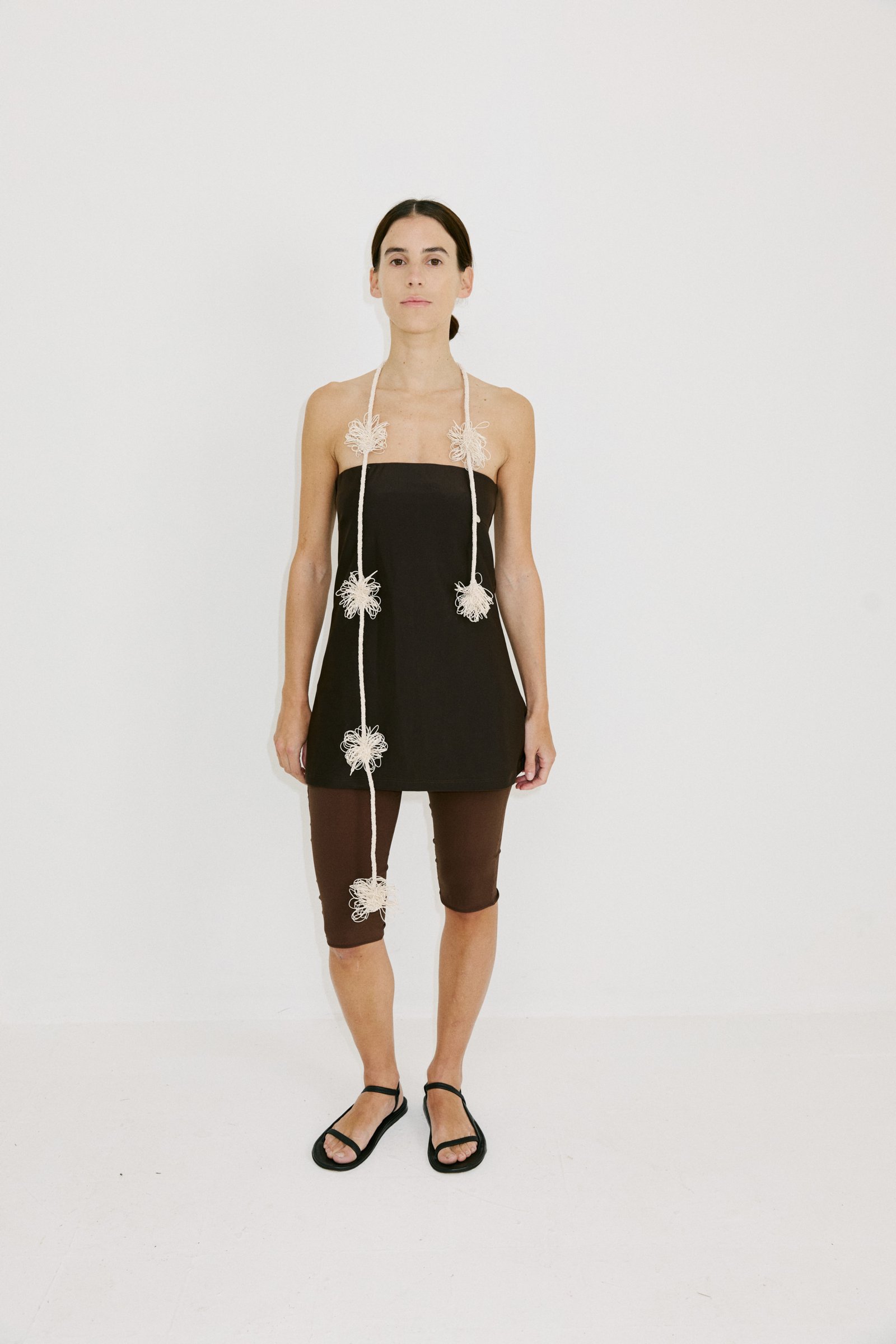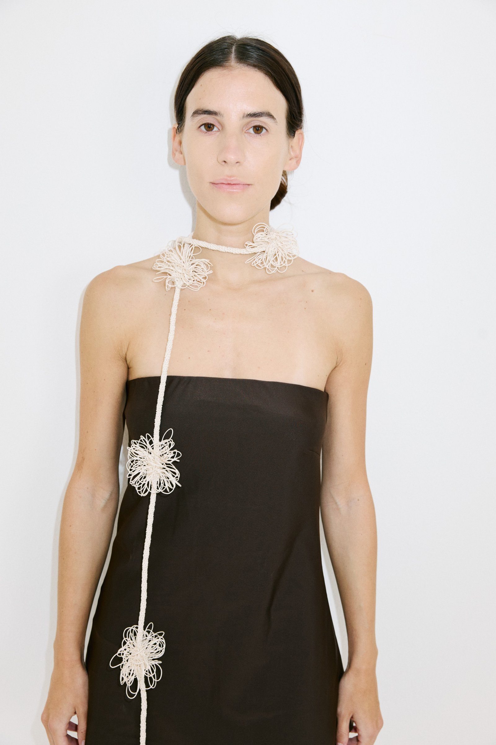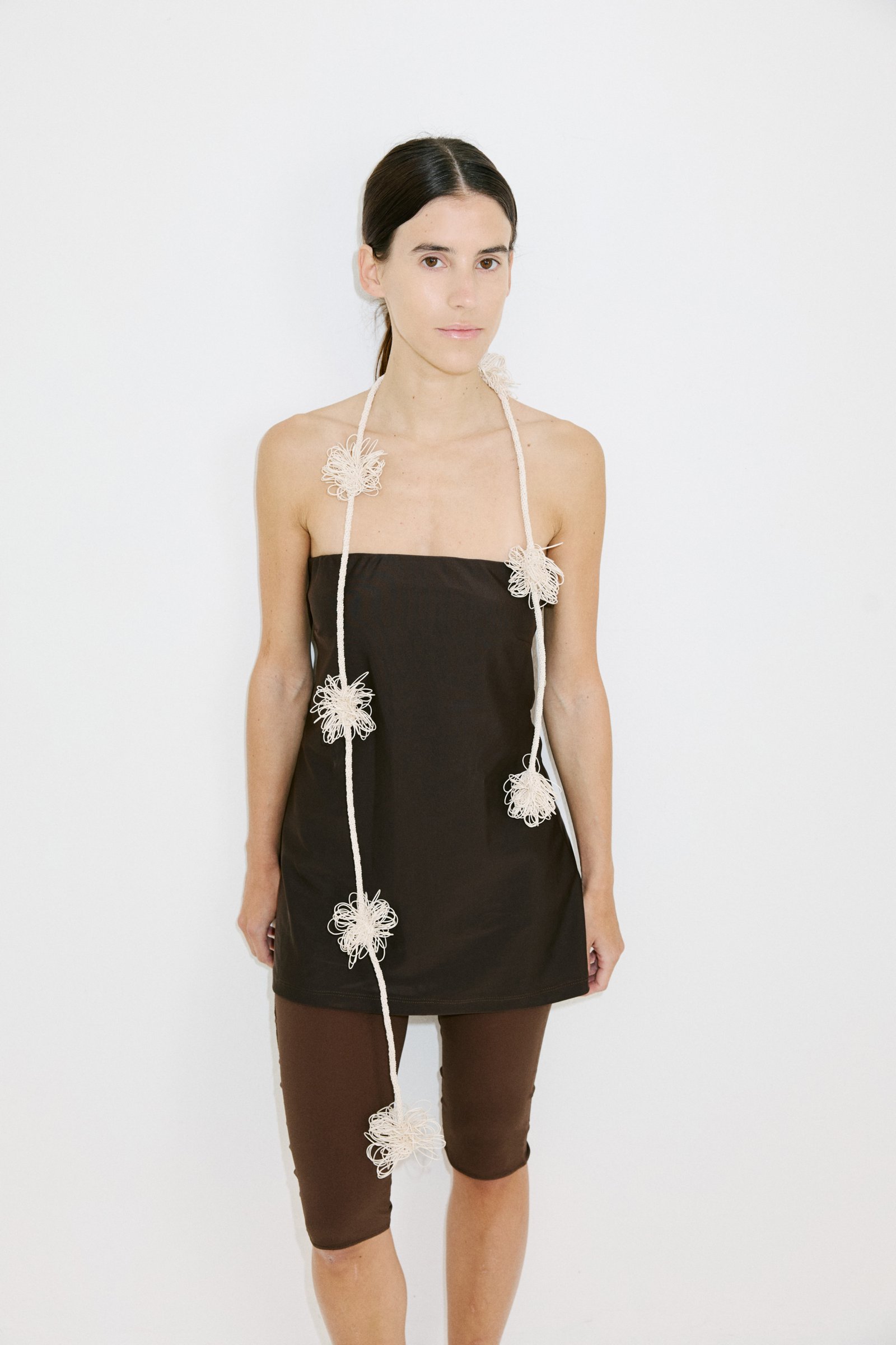 Accesorio tejido a mano con hilo de algodón encerado. Tiene una chapita metálica grabada.