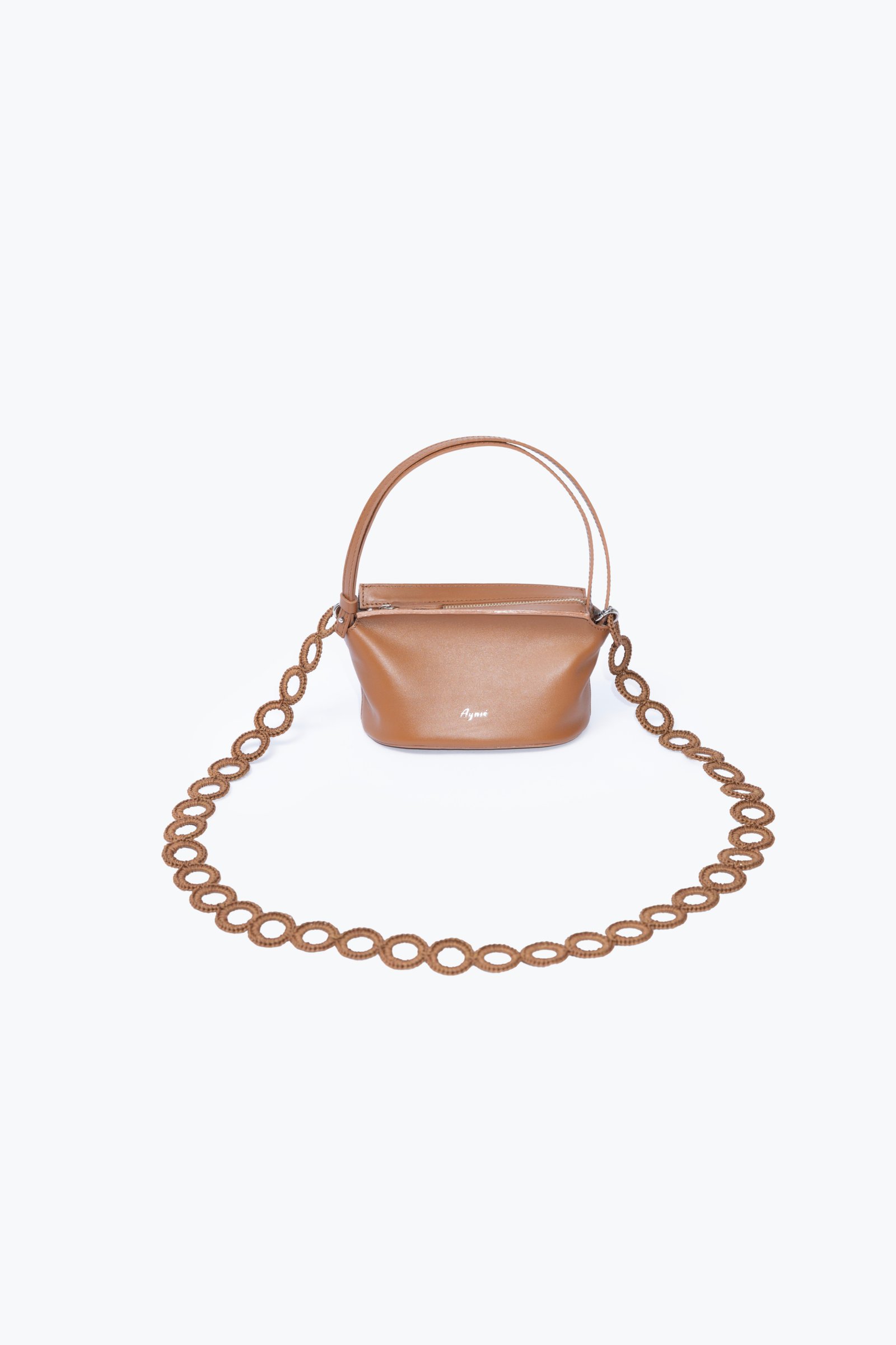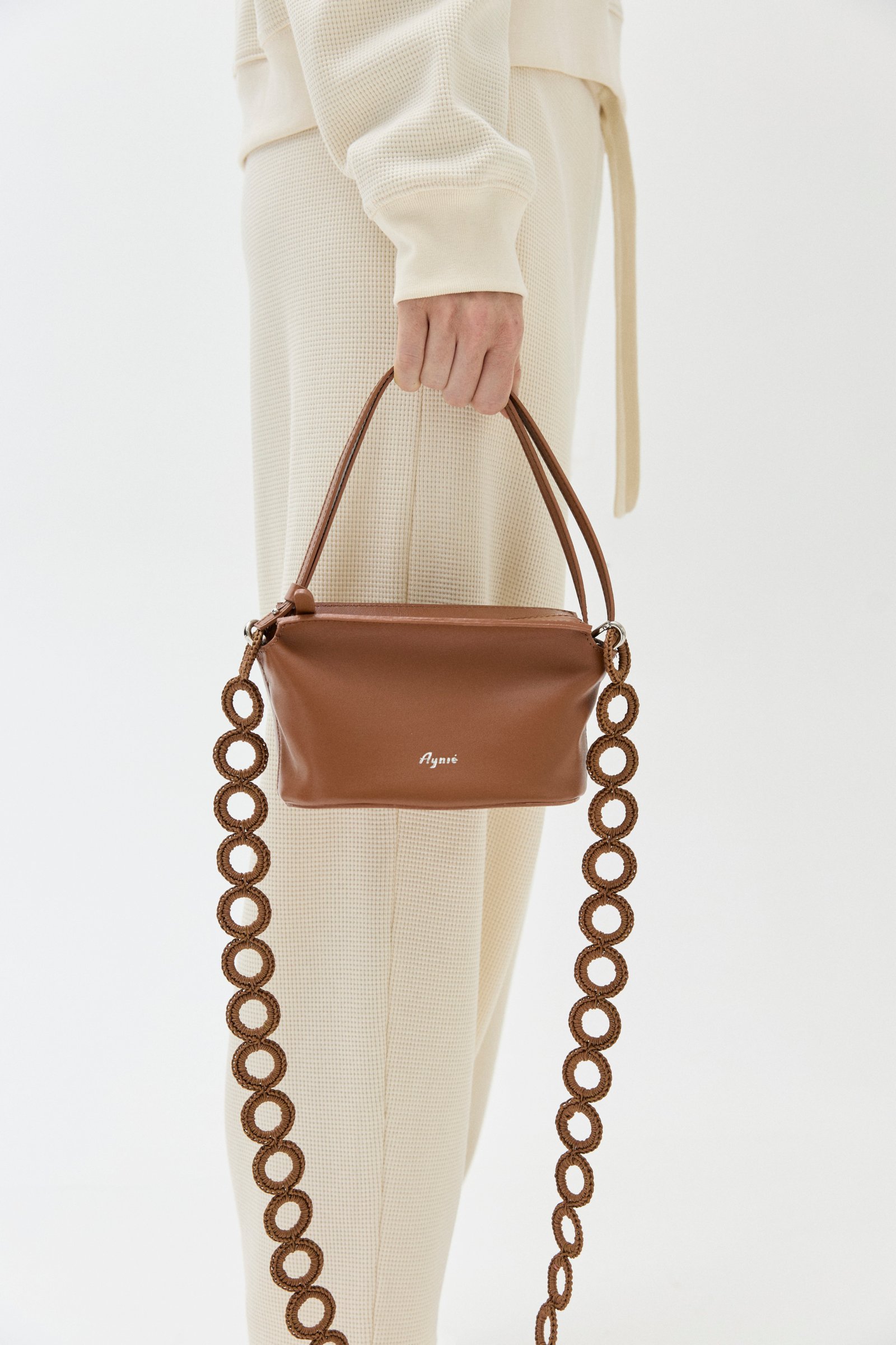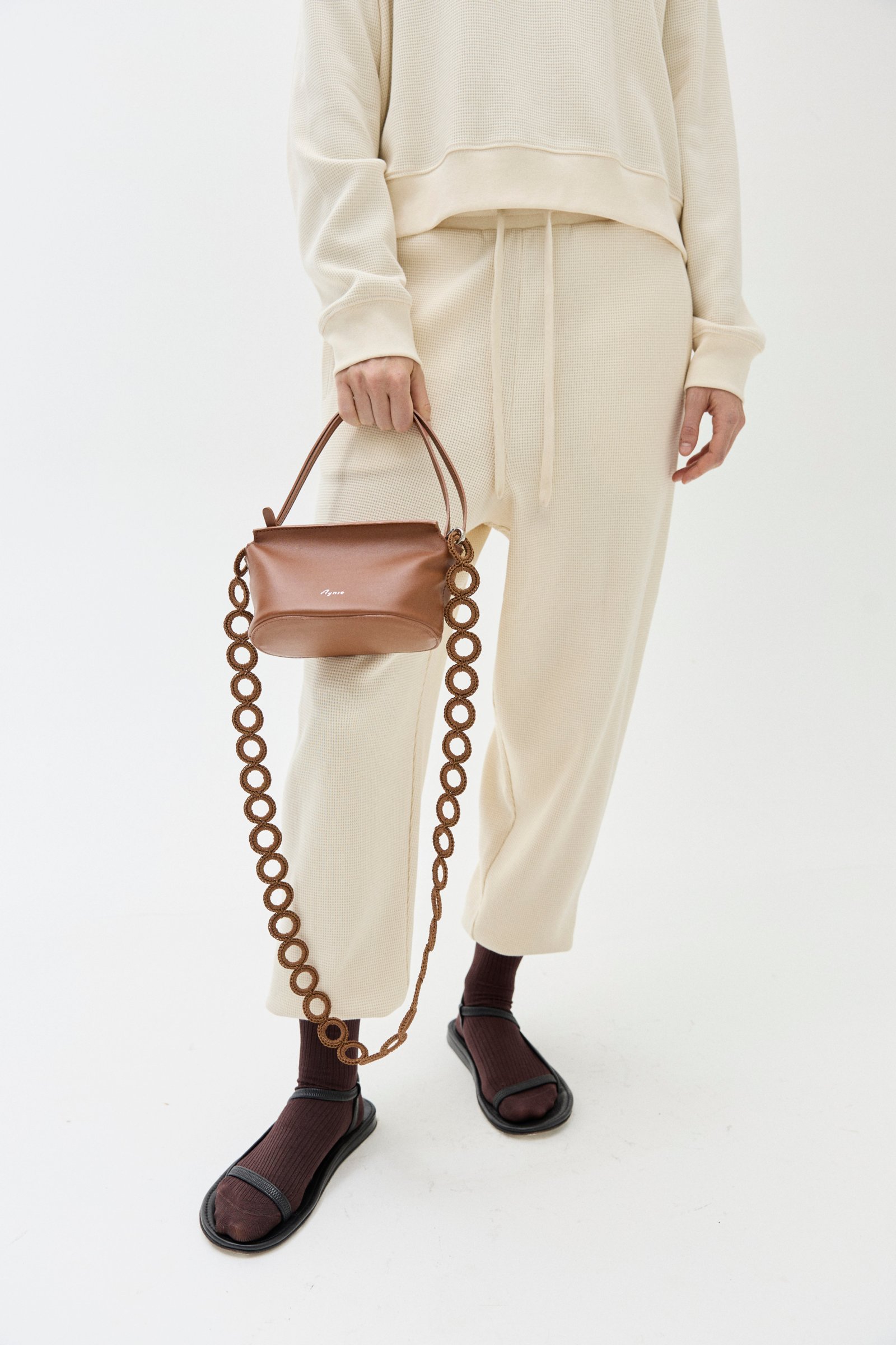 Accesorio de cuero vacuno con cierre metálico. Tiene correa calada desmontable tejida a mano con hilo de algodón encerado.