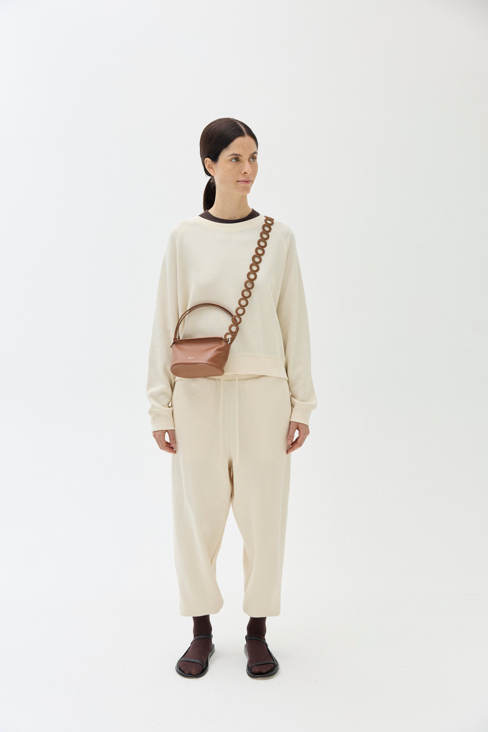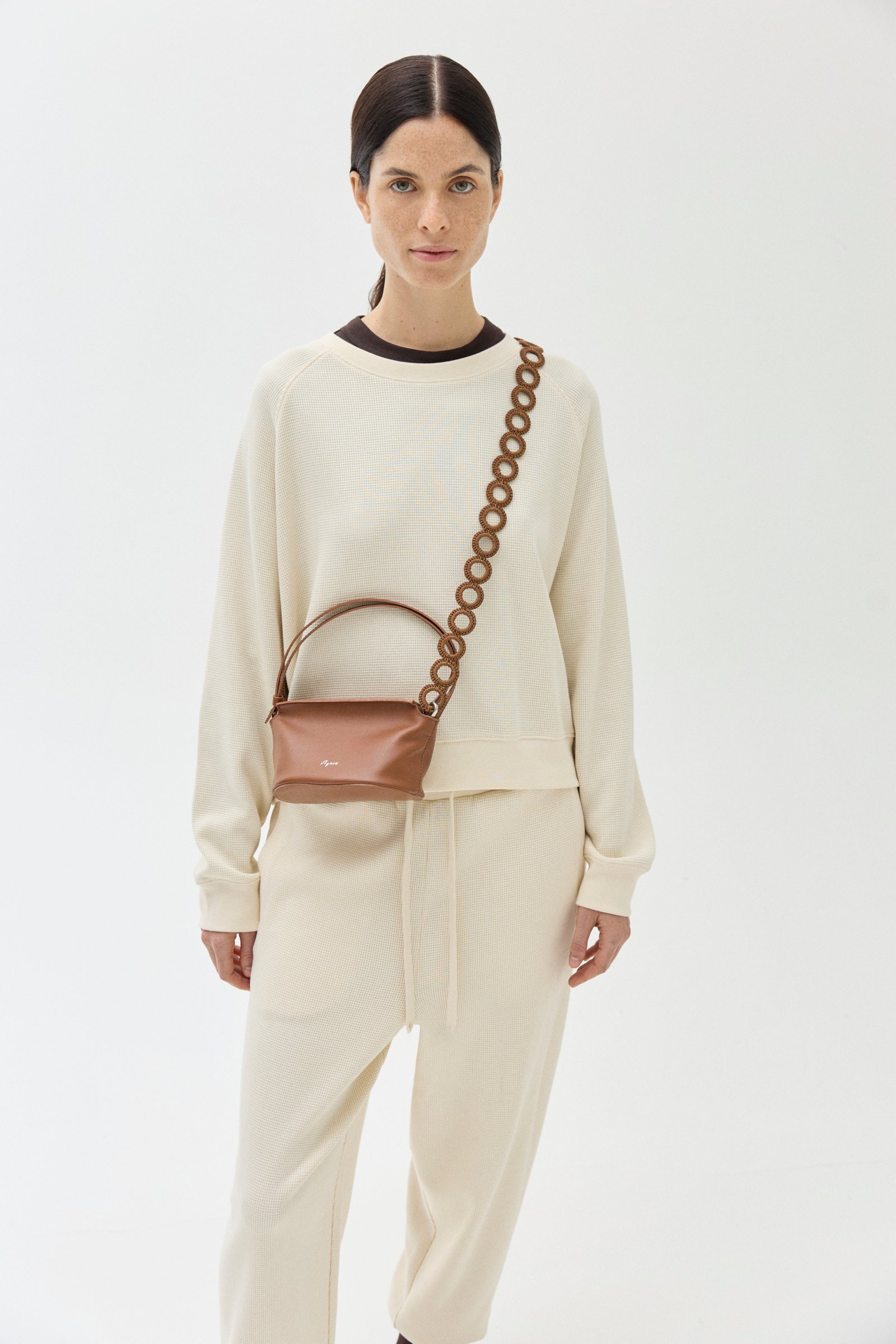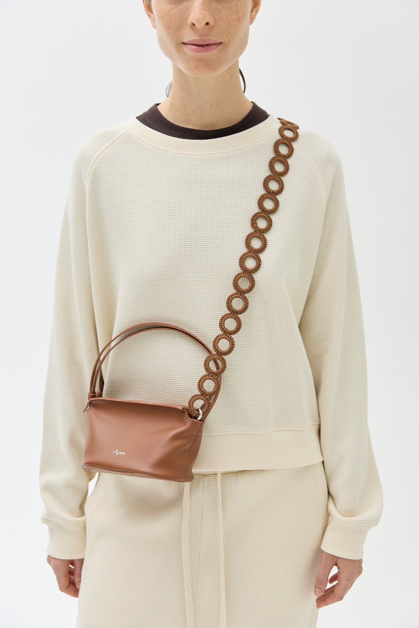 Accesorio de cuero vacuno con cierre metálico. Tiene correa calada desmontable tejida a mano con hilo de algodón encerado.
