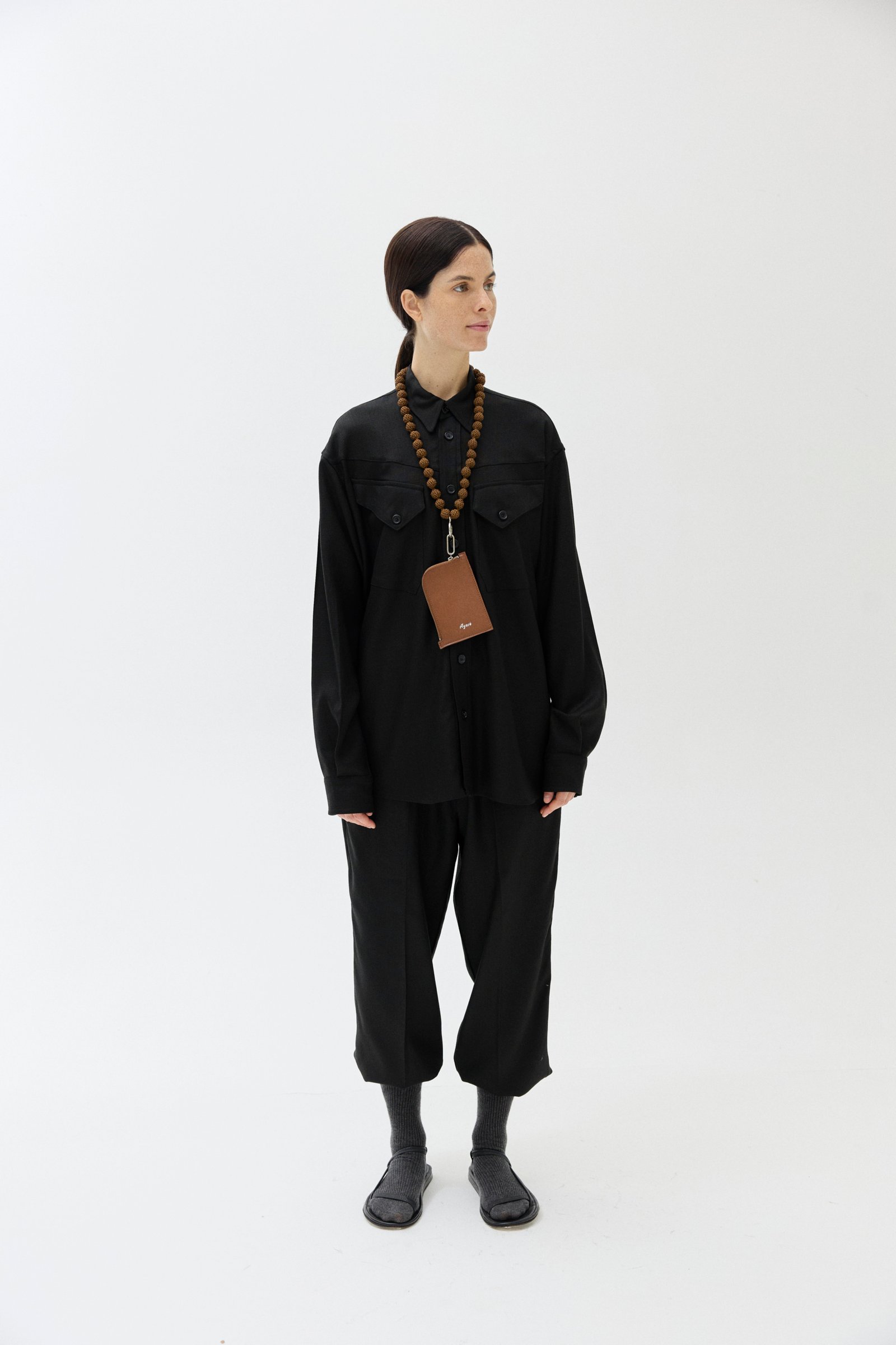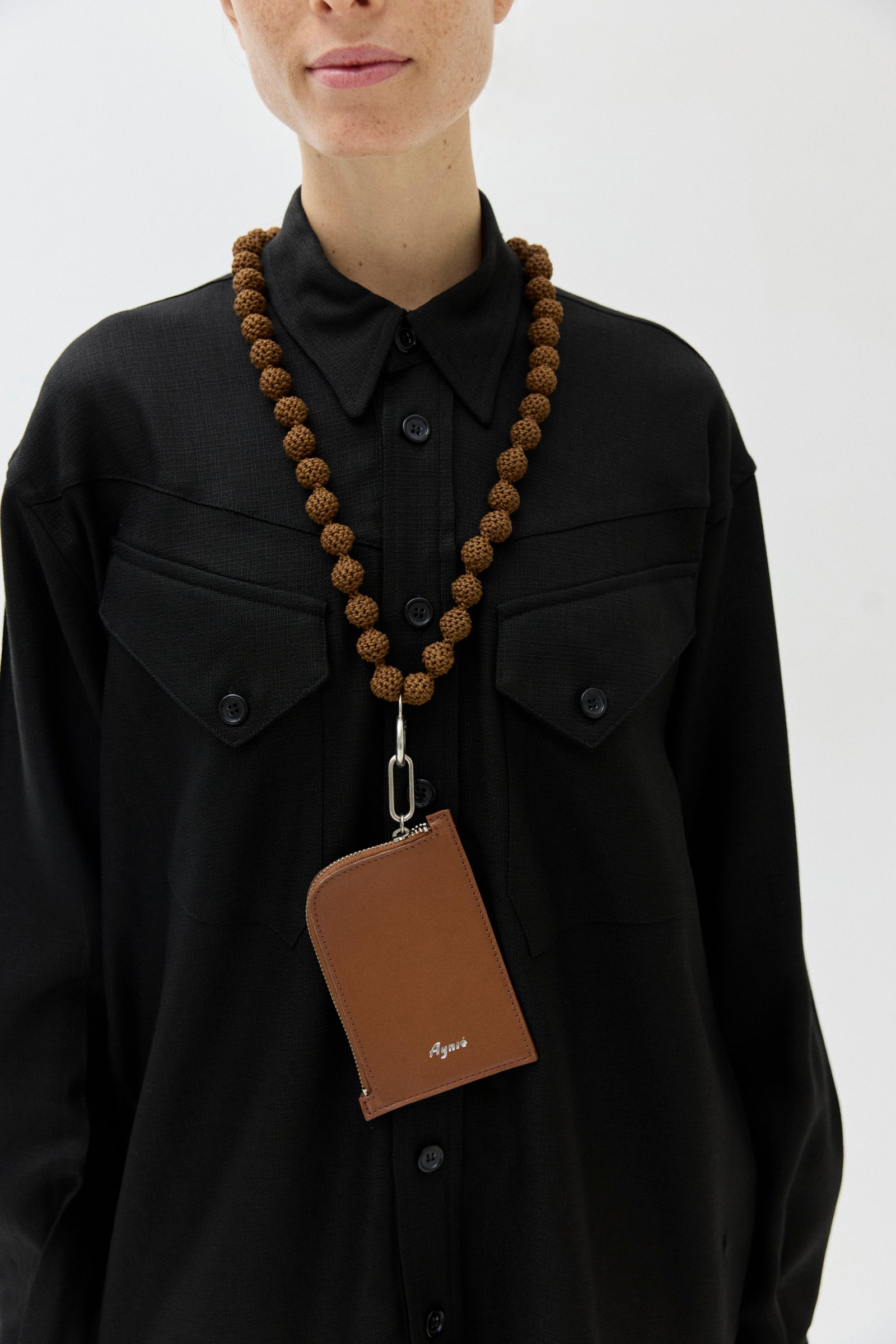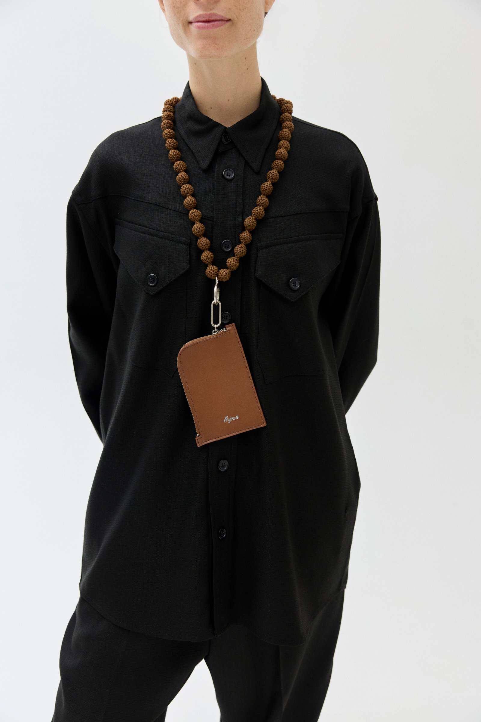 Accesorio de cuero vacuno con cierre metálico. Se cuelga del cuello con un cordón tejido a mano con hilo de algodón encerado que tiene un mosquetón metálico.
