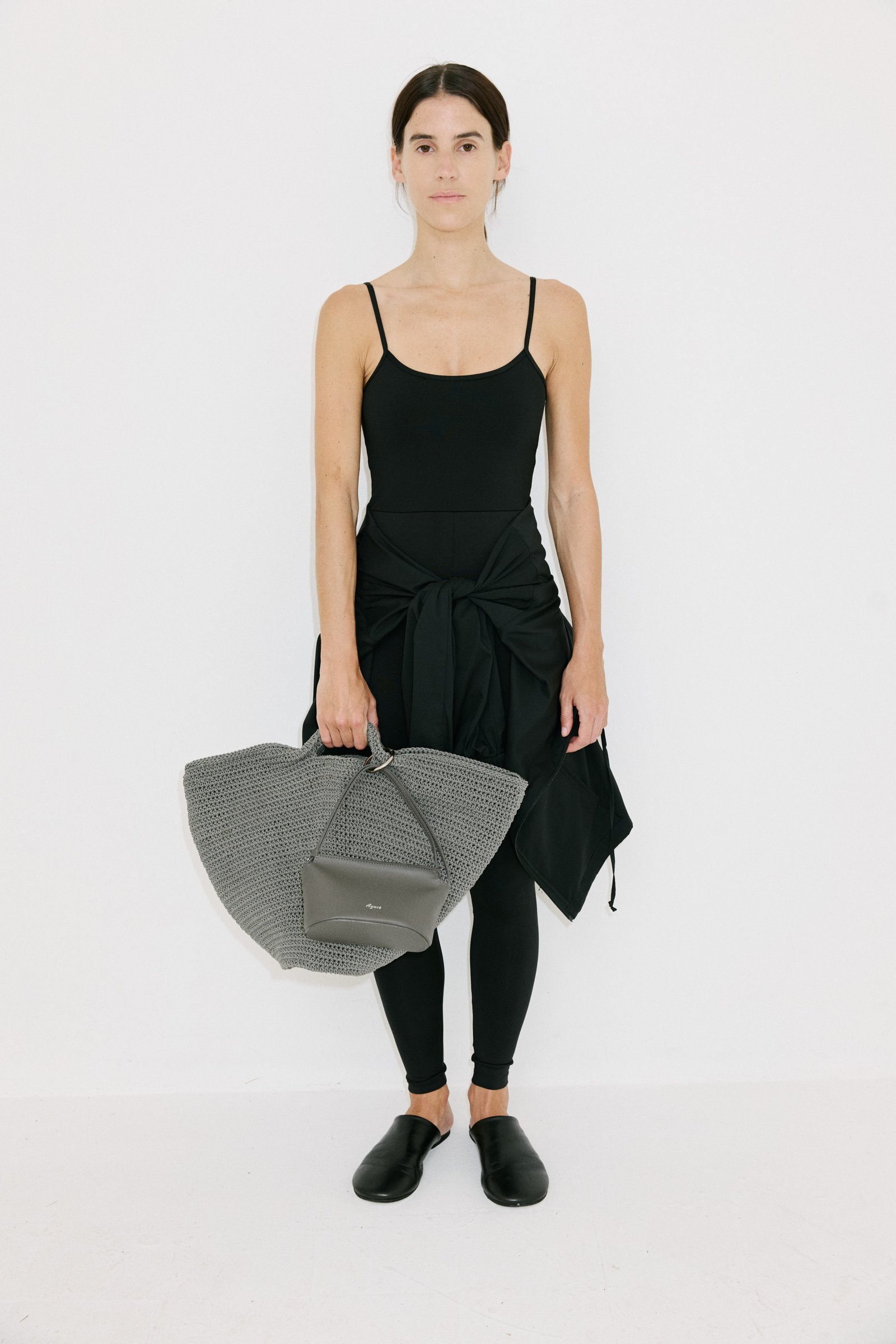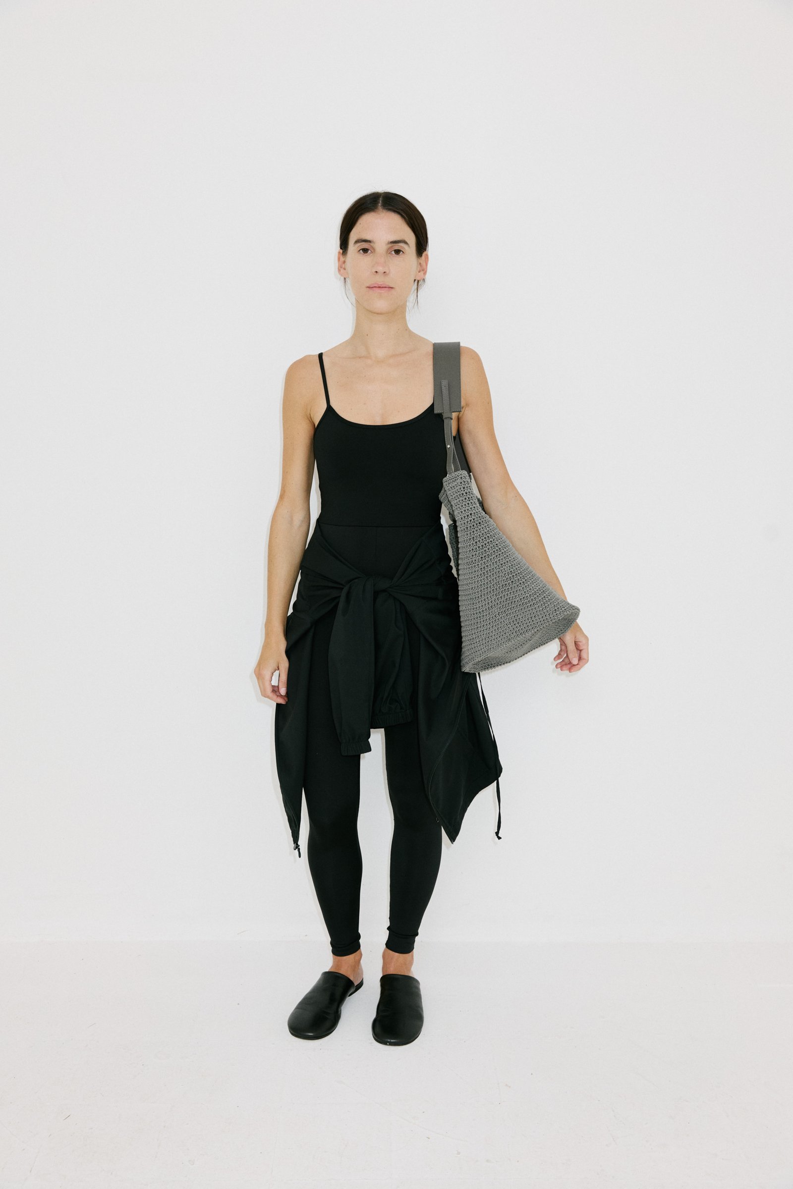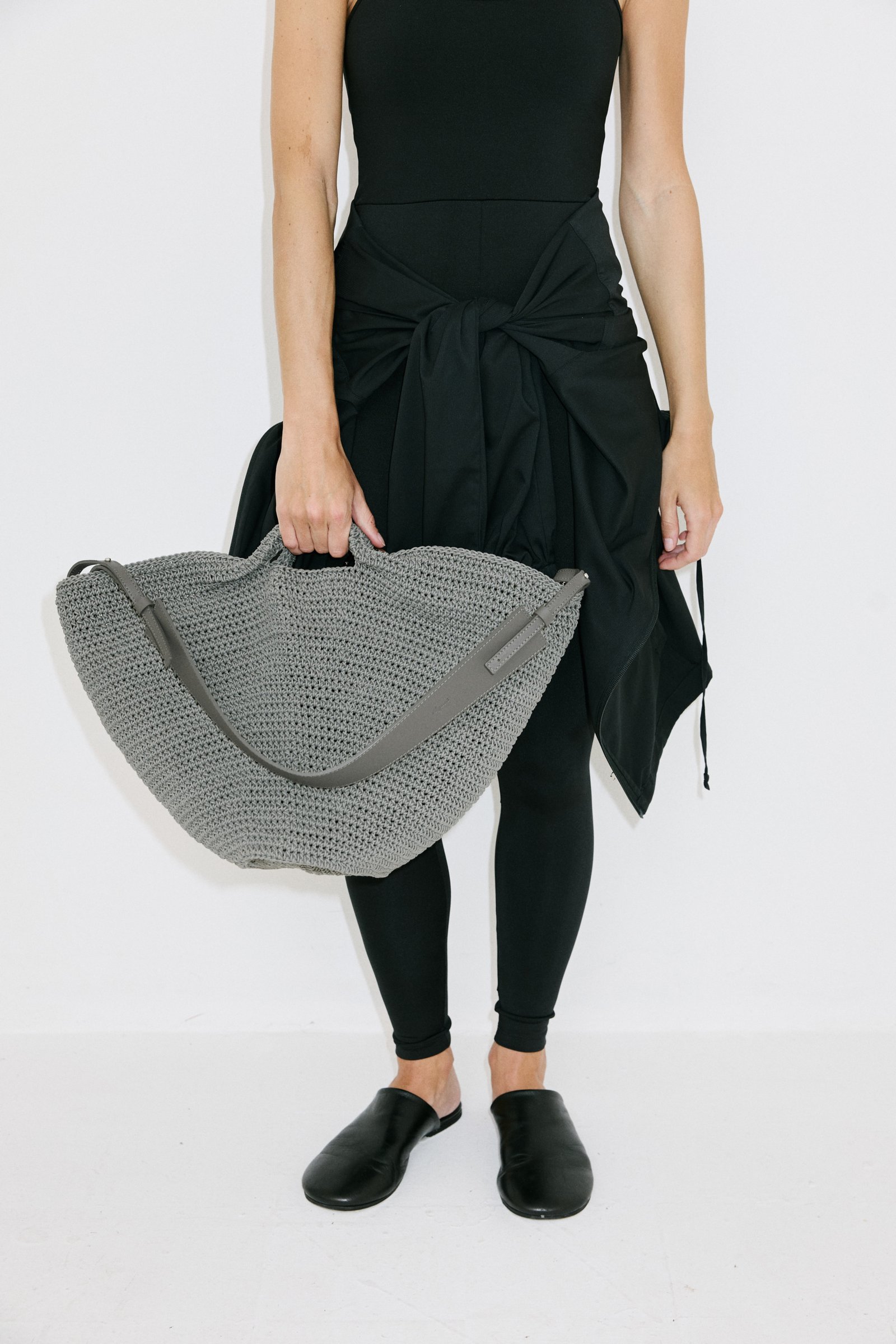 Canasta tejida a mano con hilo de algodón encerado. Tiene una correa de cuero vacuno regulable con distintas posiciones de colocación. Tiene un bolsito interno de cuero vacuno con cierre metálico que se puede usar por separado.