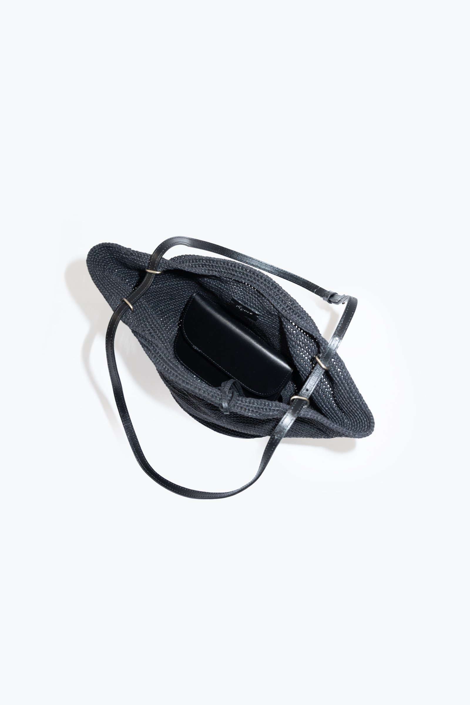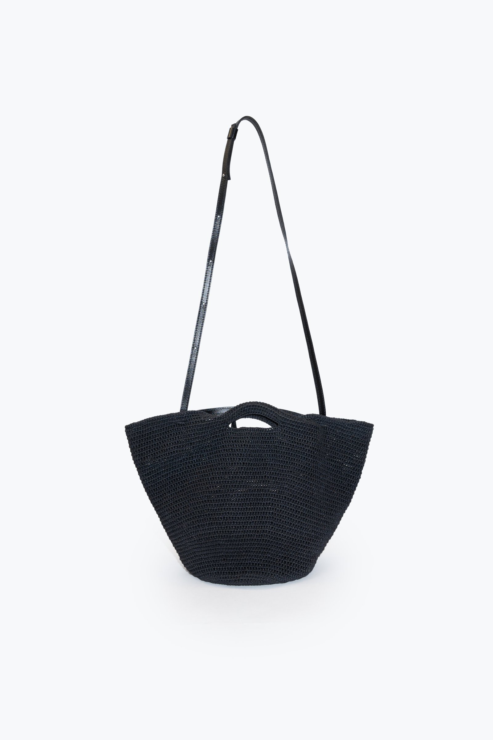 Canastita tejida a mano con hilo de algodón encerado. Tiene una correa de cuero vacuno regulable con distintas posiciones de colocación. Tiene un bolsito interno de cuero vacuno que se puede usar por separado.