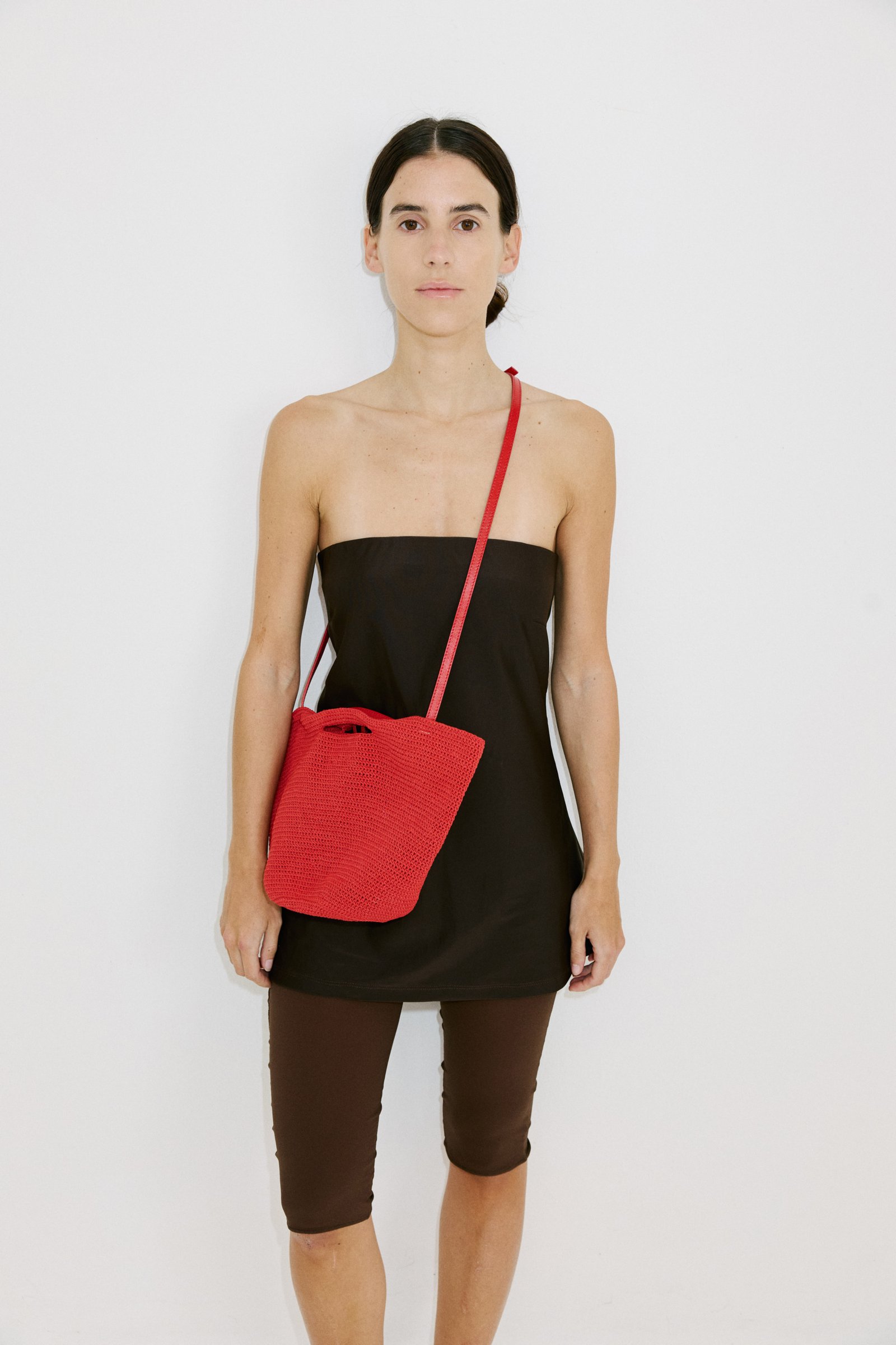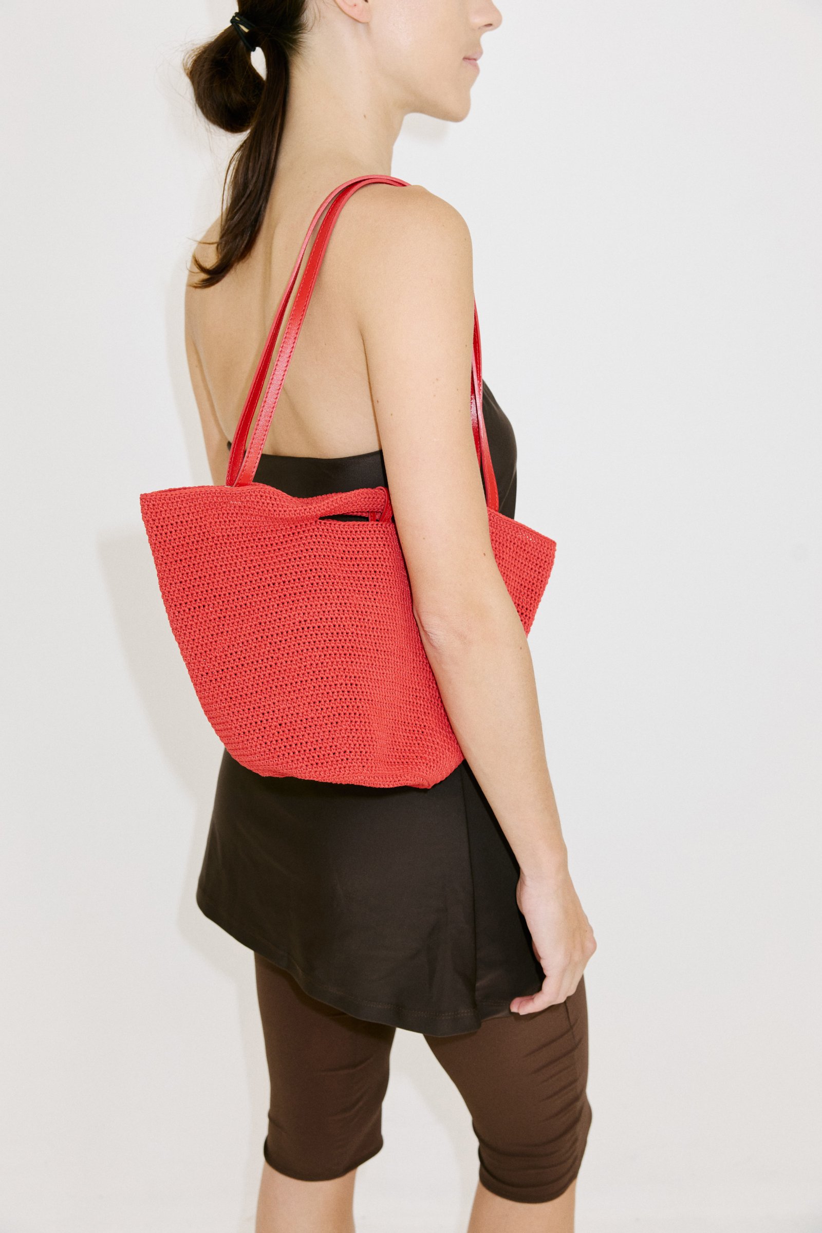 Canastita tejida a mano con hilo de algodón encerado. Tiene una correa de cuero vacuno regulable con distintas posiciones de colocación. Tiene un bolsito interno de cuero vacuno que se puede usar por separado.