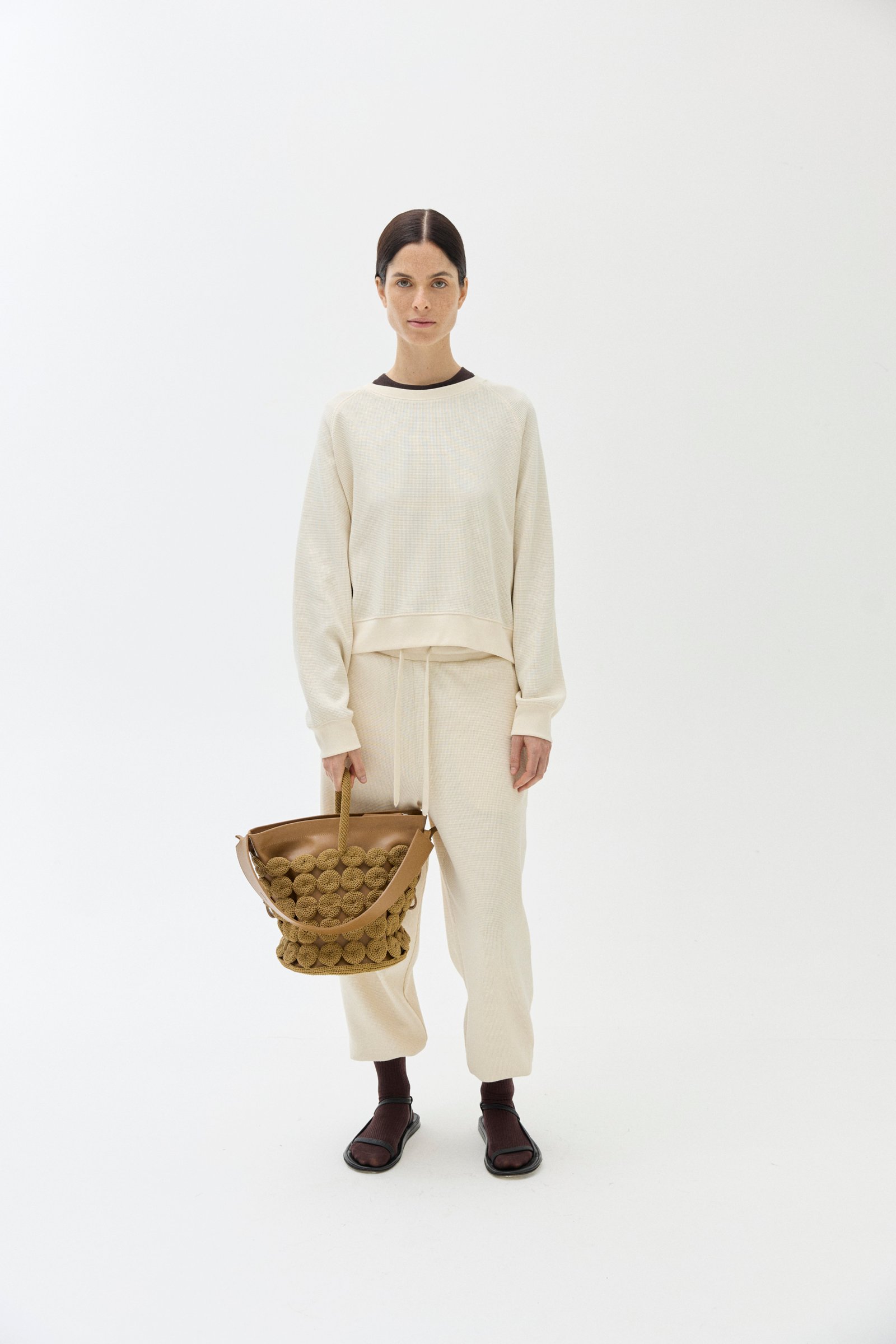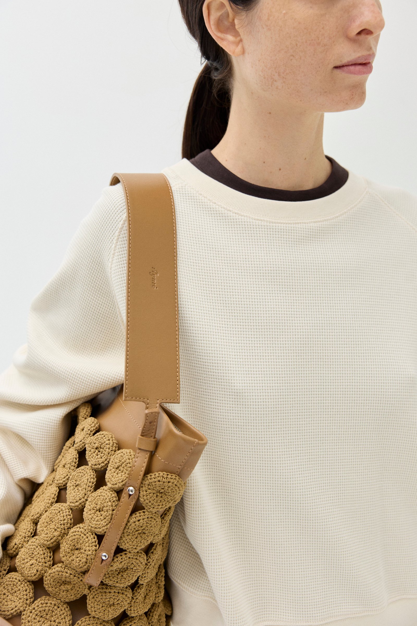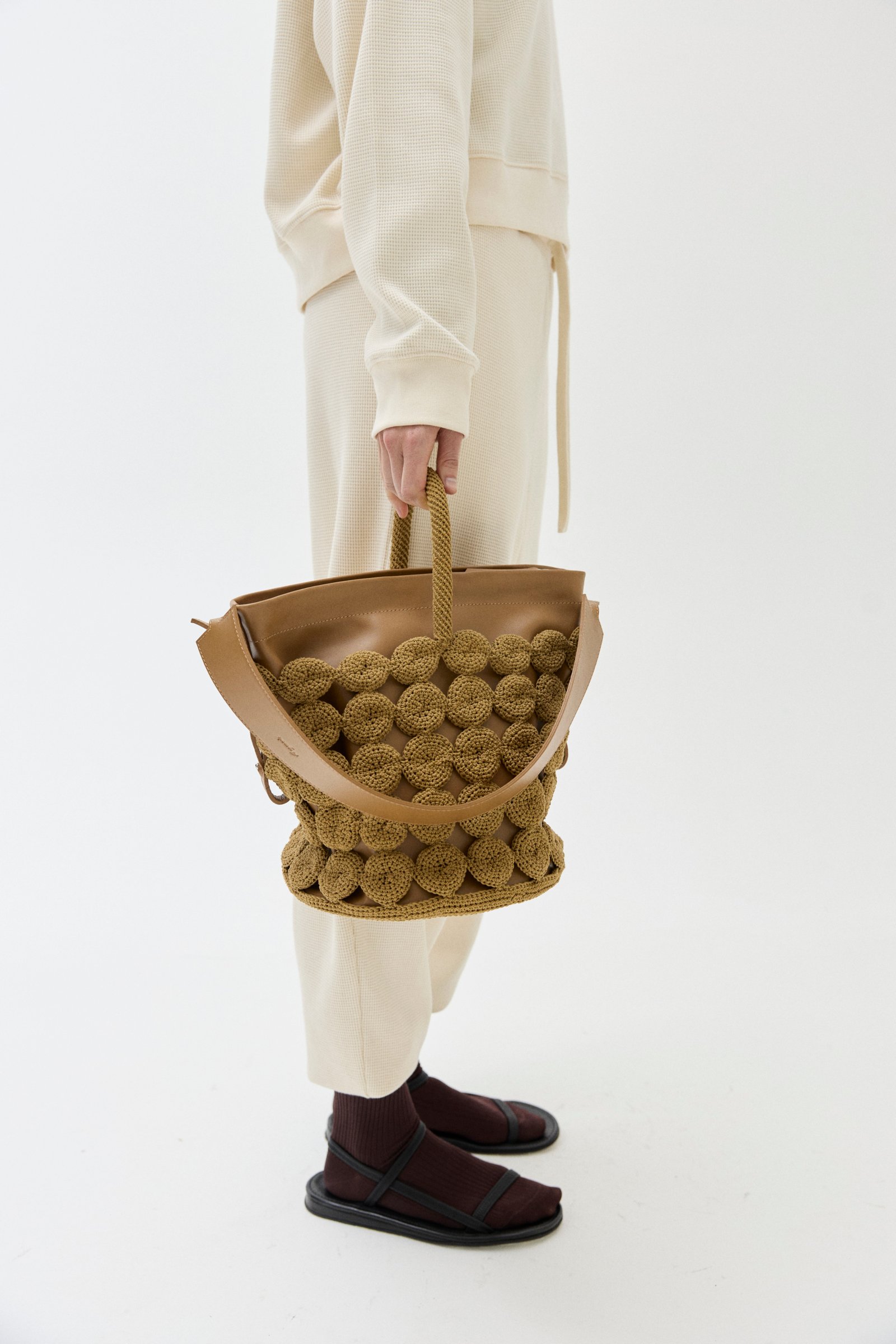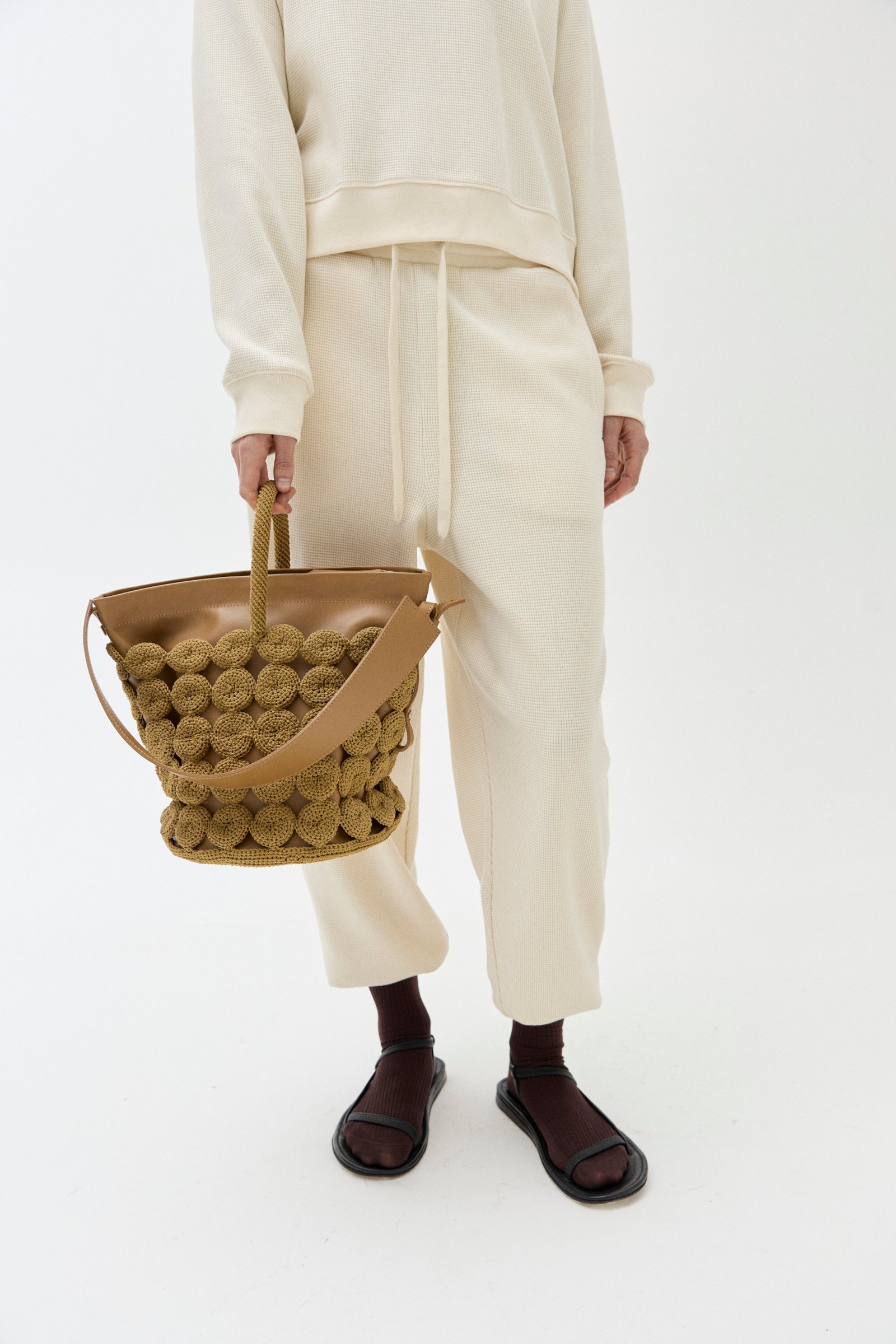 Canasta tejida a mano con hilo de algodón encerado. Bolso interno desmontable de cuero vacuno y cierre metálico. Se pueden usar por separado. Tiene correa regulable de cuero vacuno.