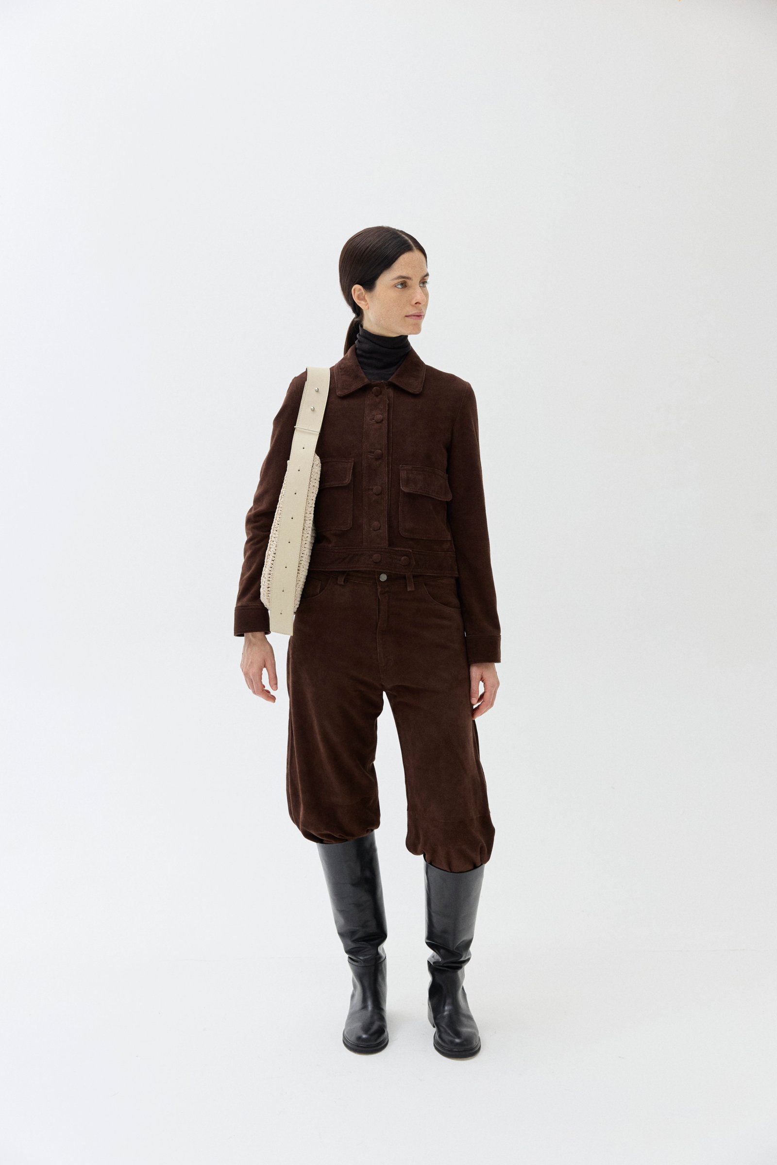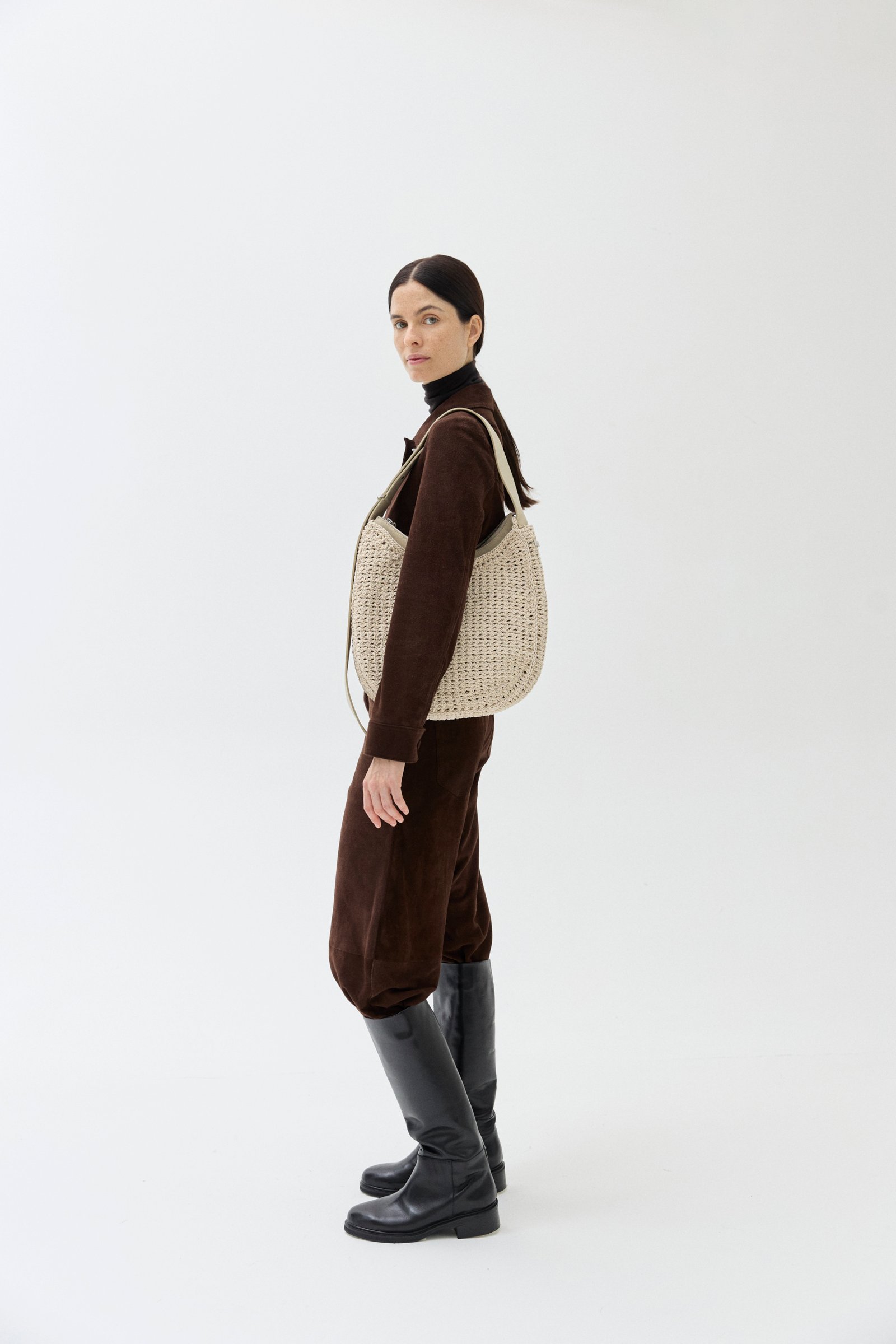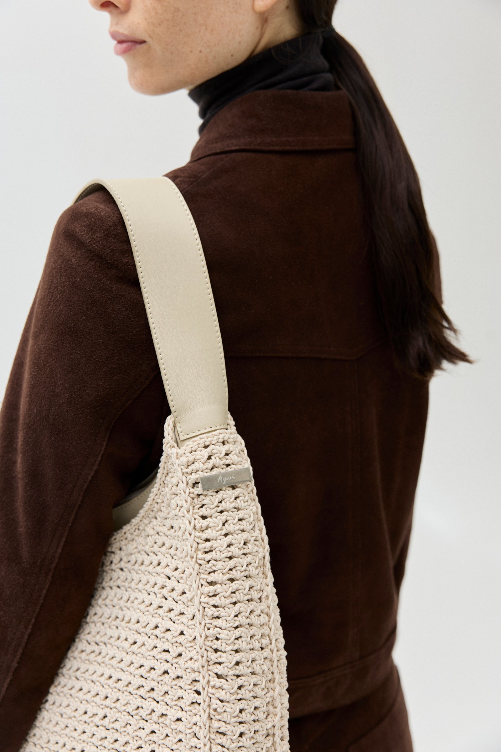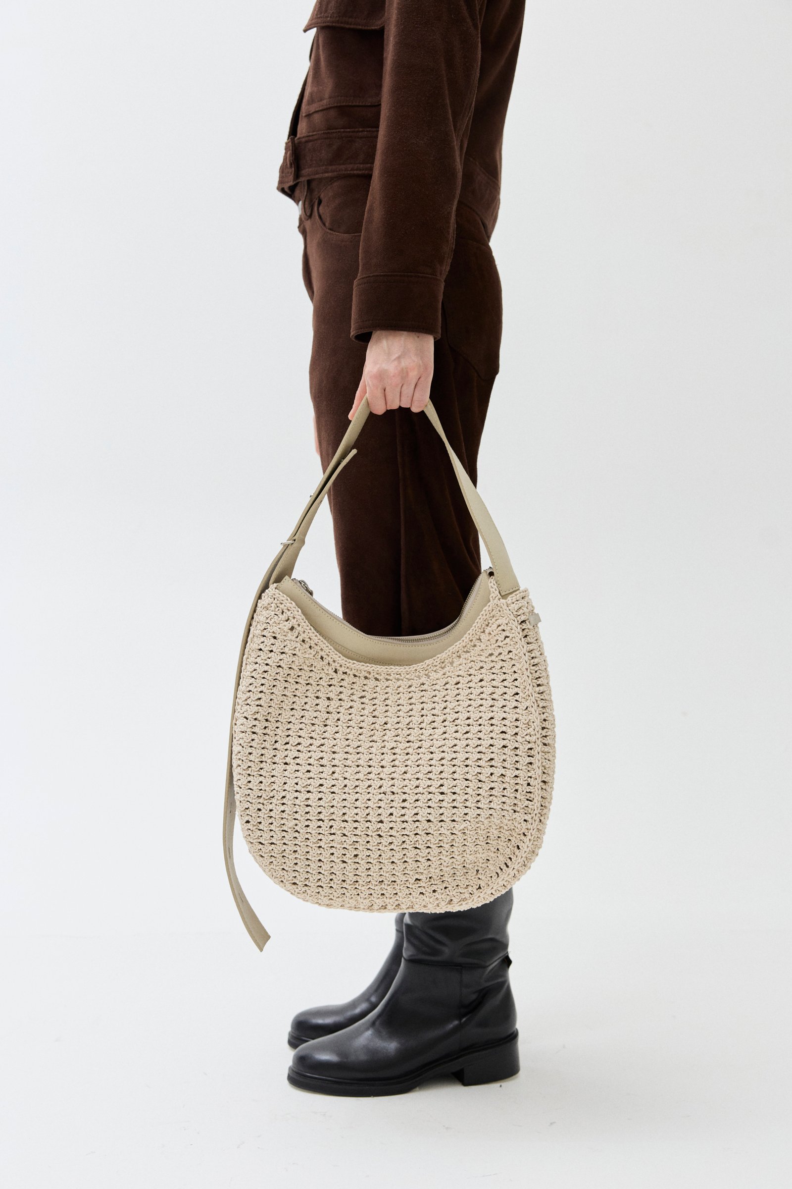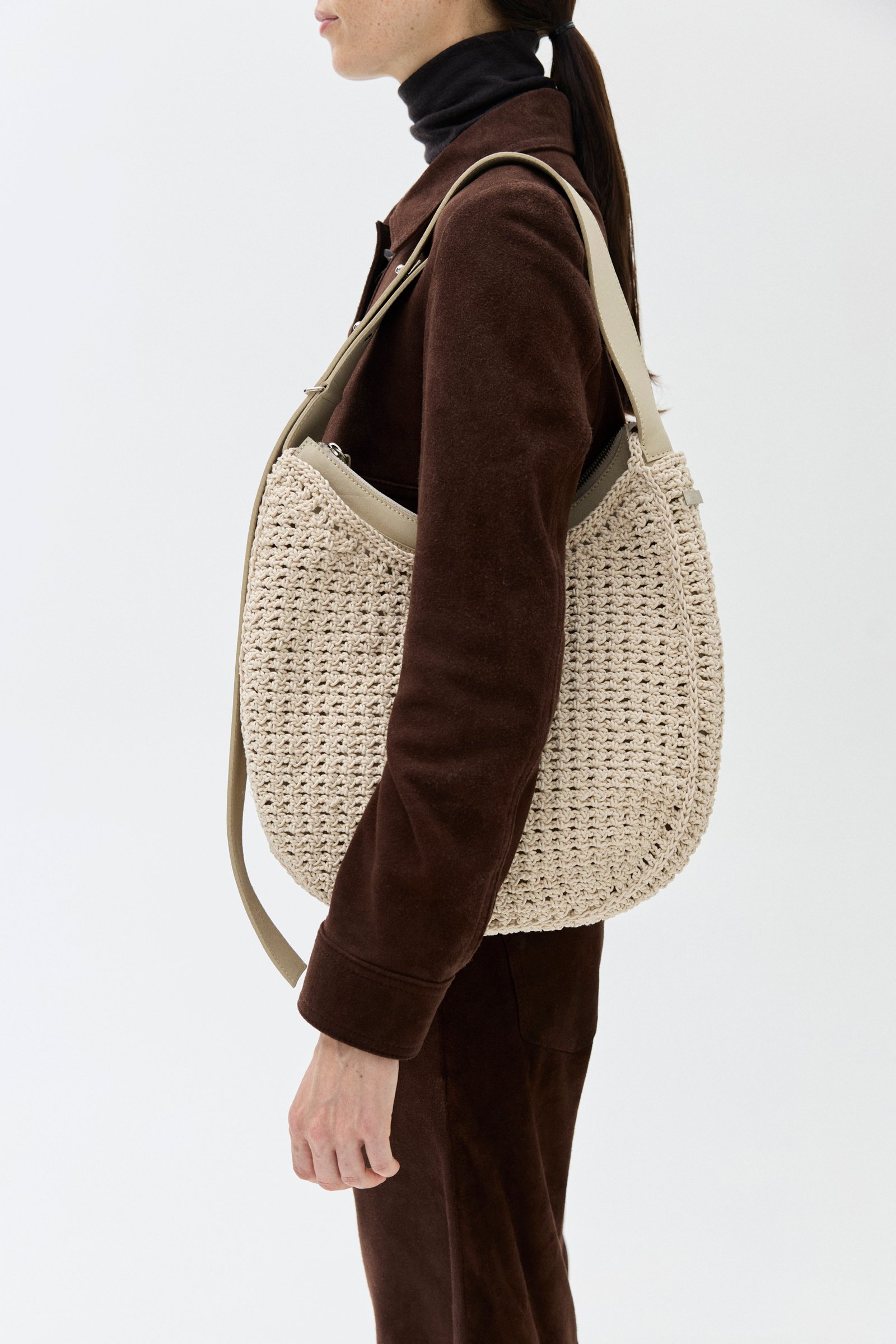 Entramado calado tejido a mano con hilo de algodón encerado. Bolso interno desmontable de cuero vacuno con correa regulable. Se pueden usar por separado.