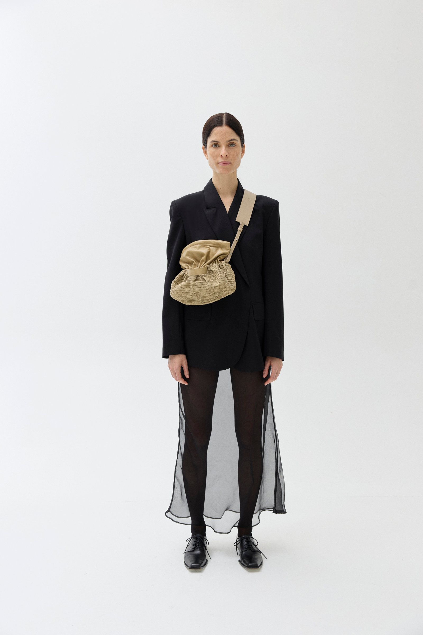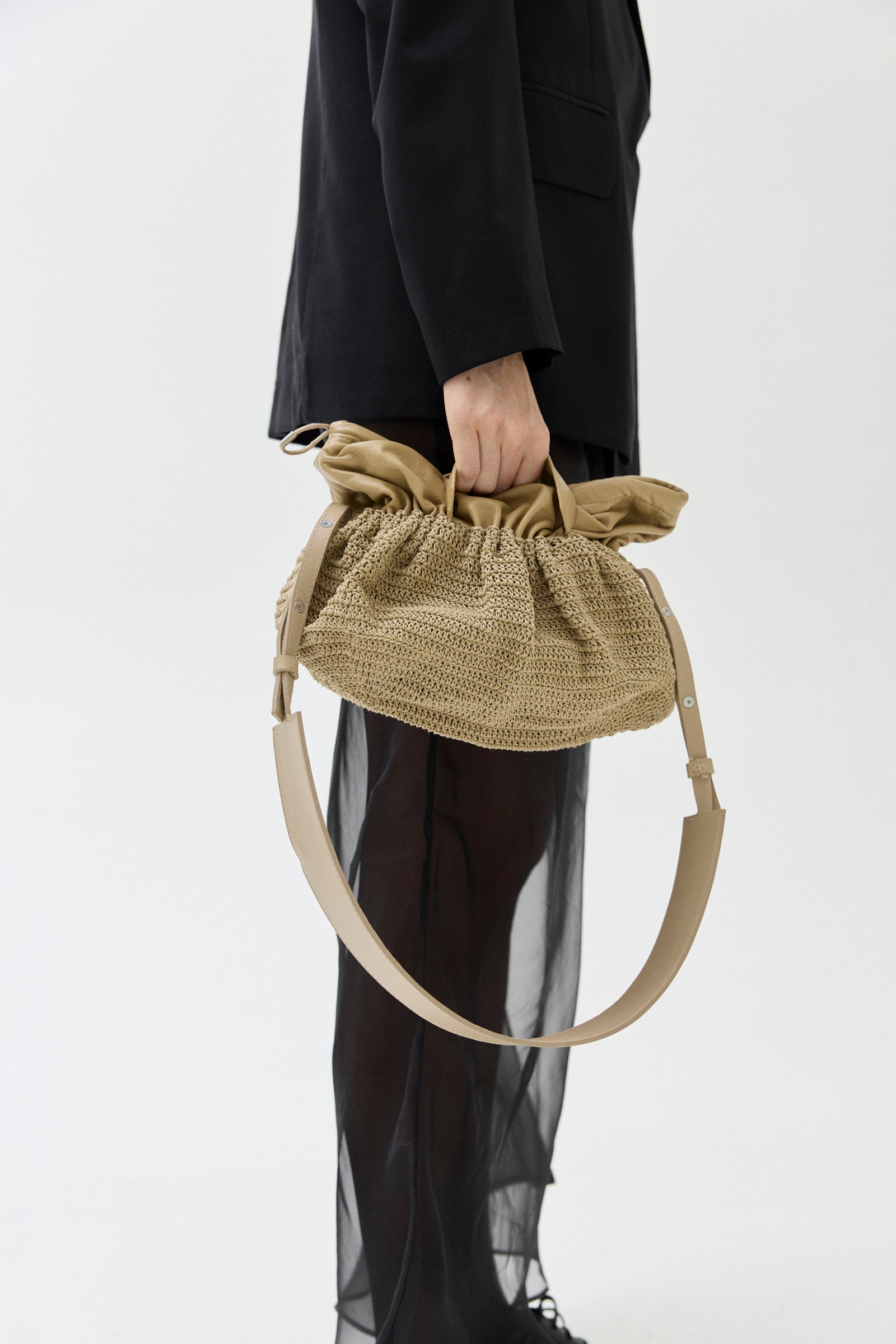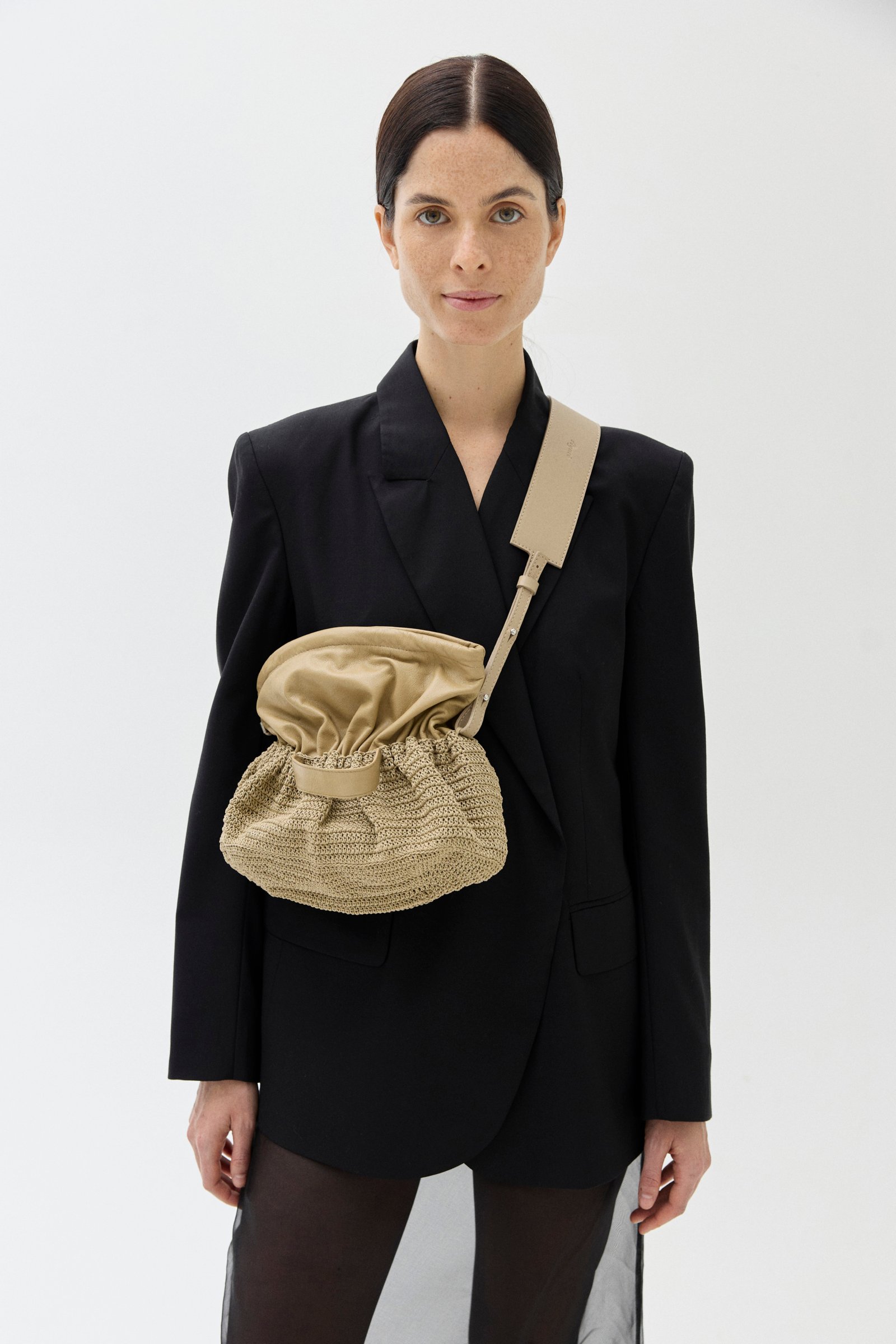 Cartera tejida a mano con hilo de algodón encerado y fuelle de cuero de oveja. Cierra con frunce y unos pequeños imanes. Tiene forrería de algodón, bolsillo interno y correa regulable de cuero vacuno.