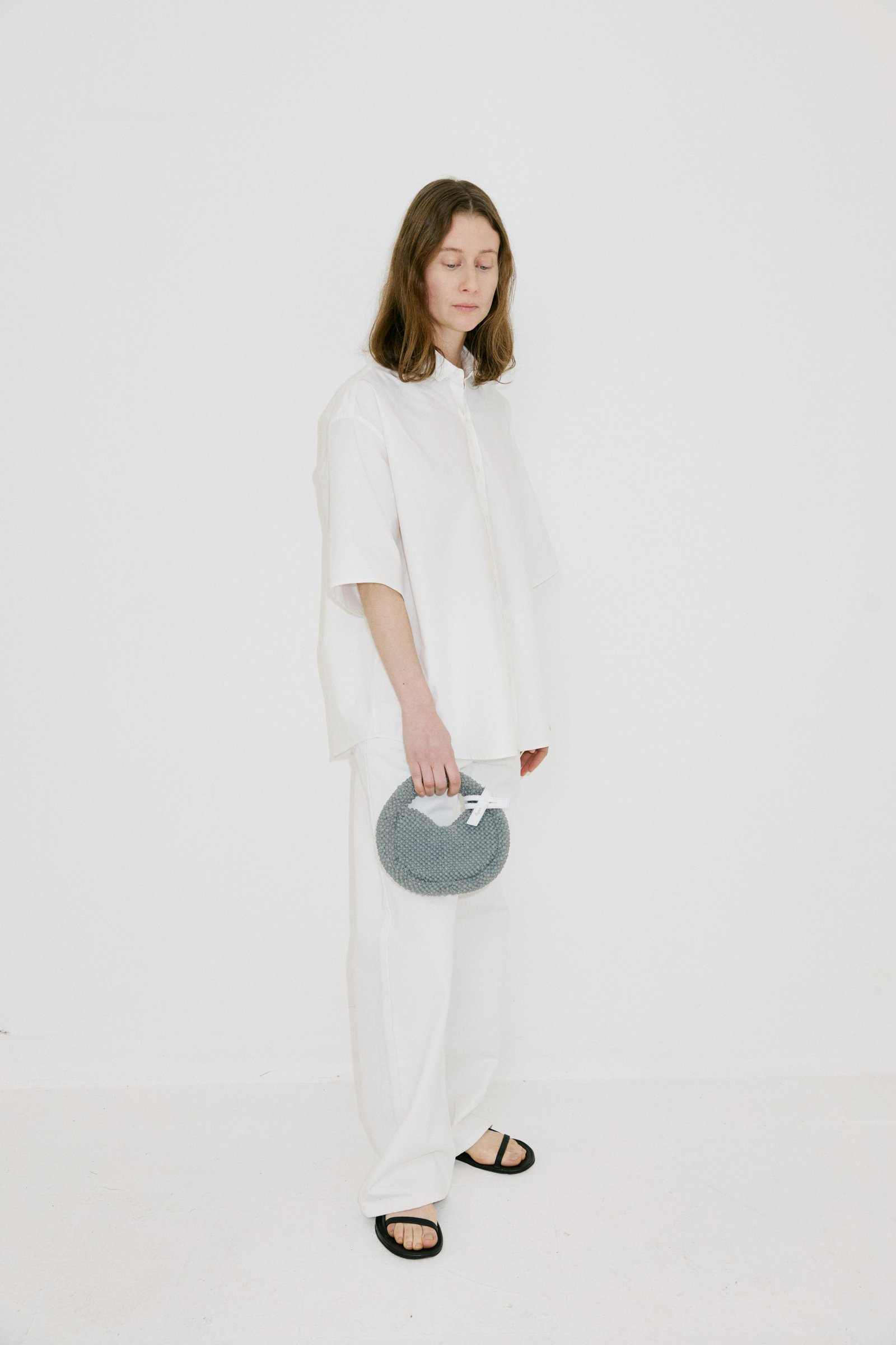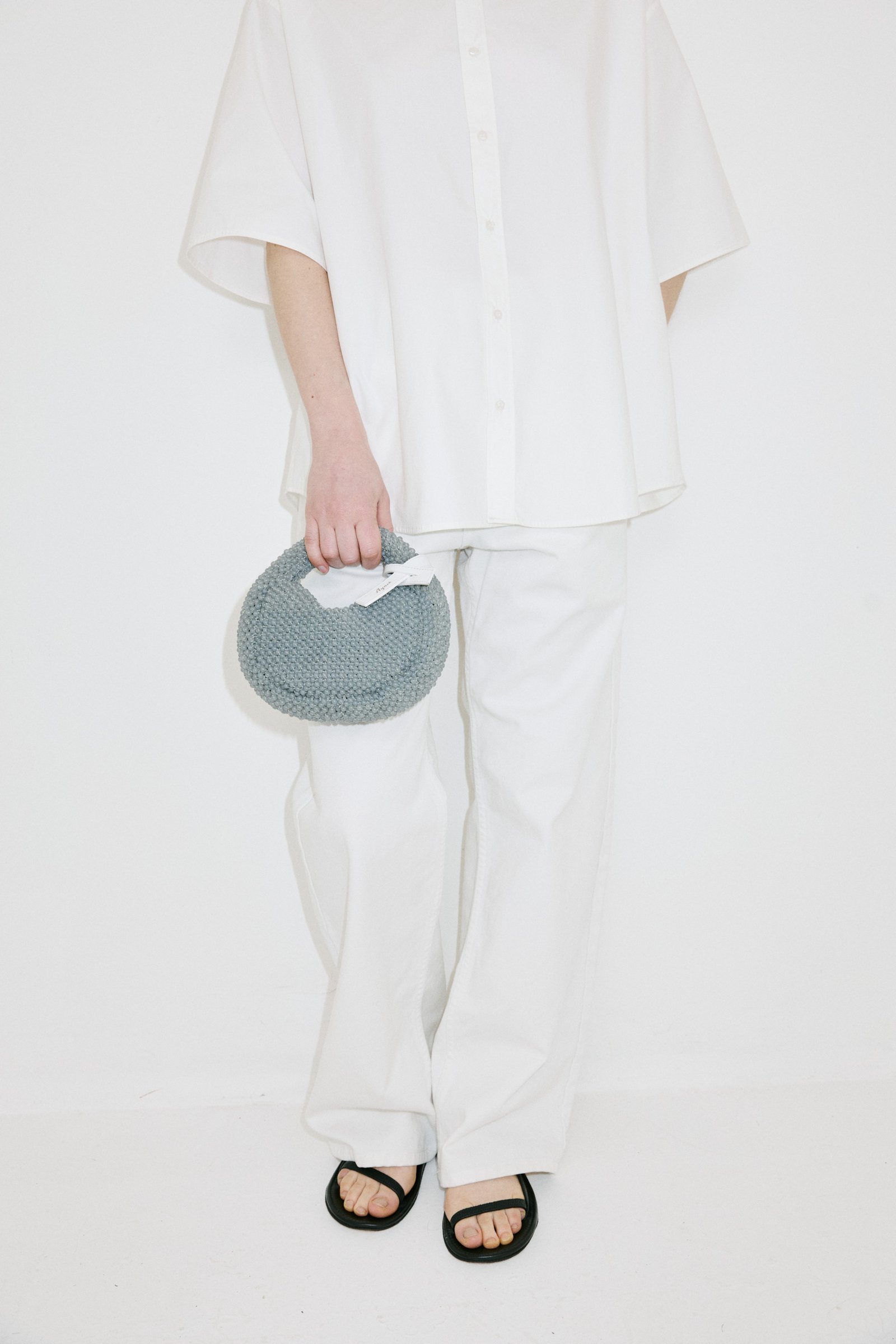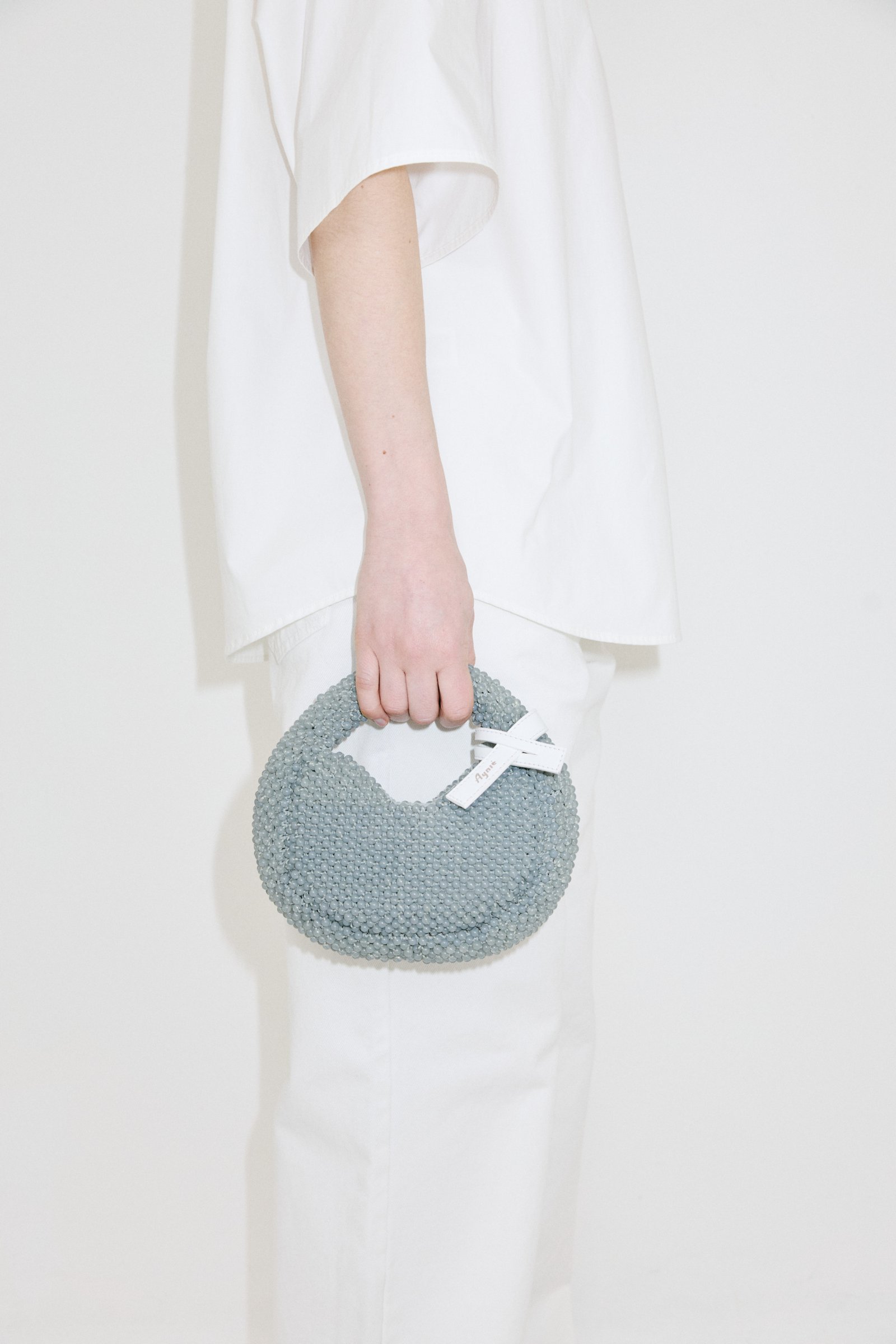 Carterita de mano tejida a mano con hilo de algodón y cuentas de vidrio. Cierra con imán y tiene detalle en cuero vacuno.