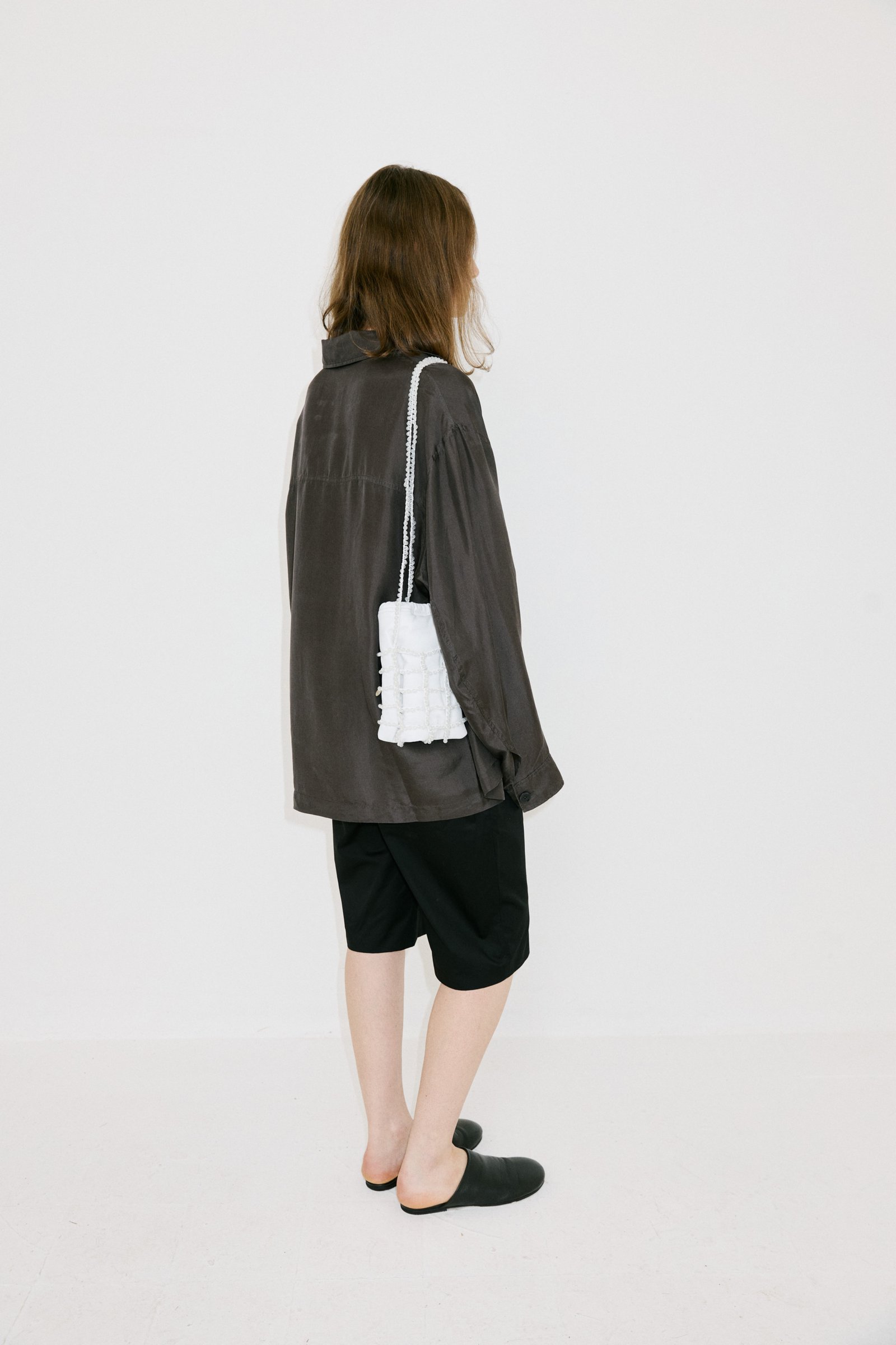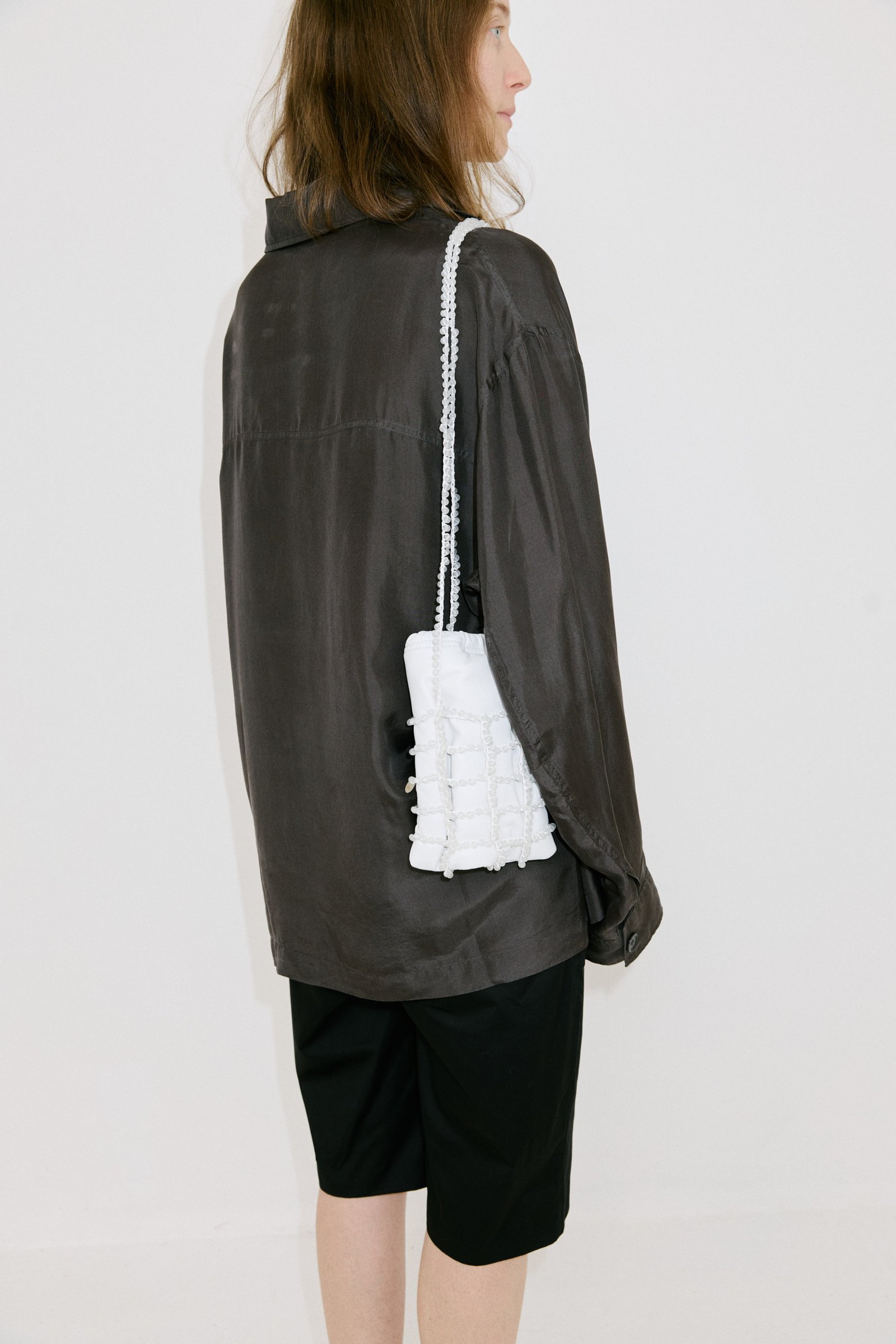 Carterita tejida a mano con hilo de algodón encerado y cuentas de vidrio. Sobre interno de cuero de oveja. Cierra con frunce y un pequeño imán. Tiene forrería de algodón y bolsillo interno.