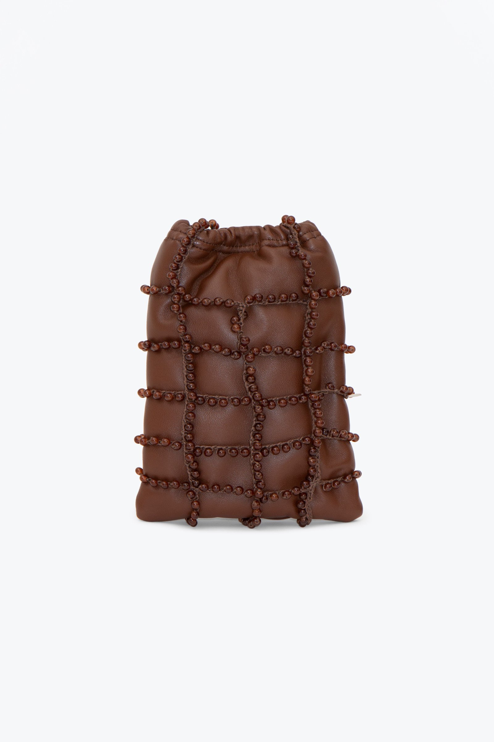 Carterita tejida a mano con hilo de algodón encerado y cuentas de vidrio. Sobre interno de cuero de oveja. Cierra con frunce y un pequeño imán. Tiene forrería de algodón y bolsillo interno.