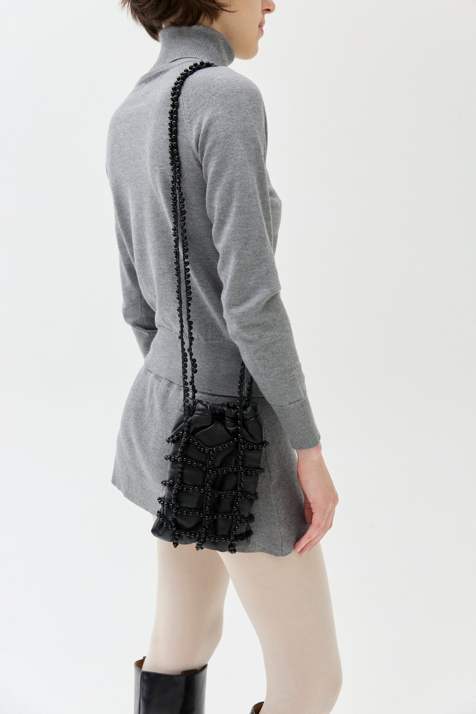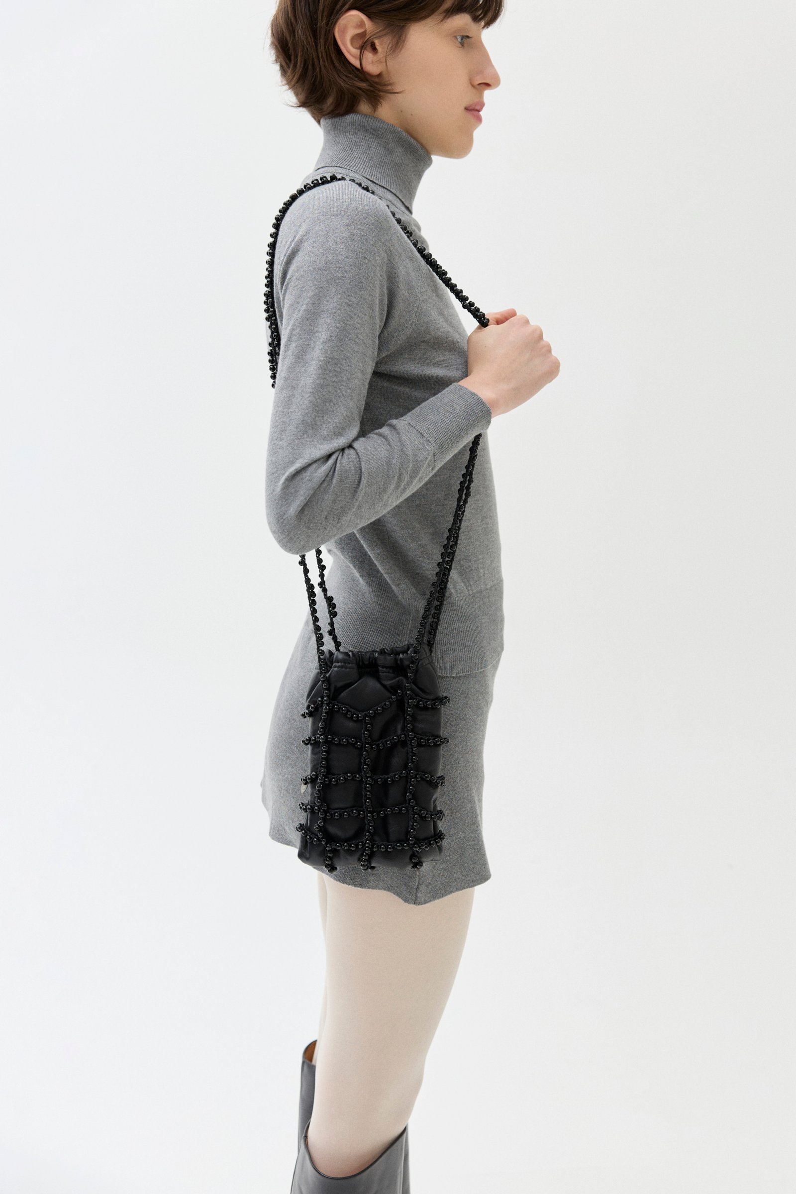 Carterita tejida a mano con hilo de algodón encerado y cuentas de vidrio. Sobre interno de cuero de oveja. Cierra con frunce y un pequeño imán. Tiene forrería de algodón y bolsillo interno.