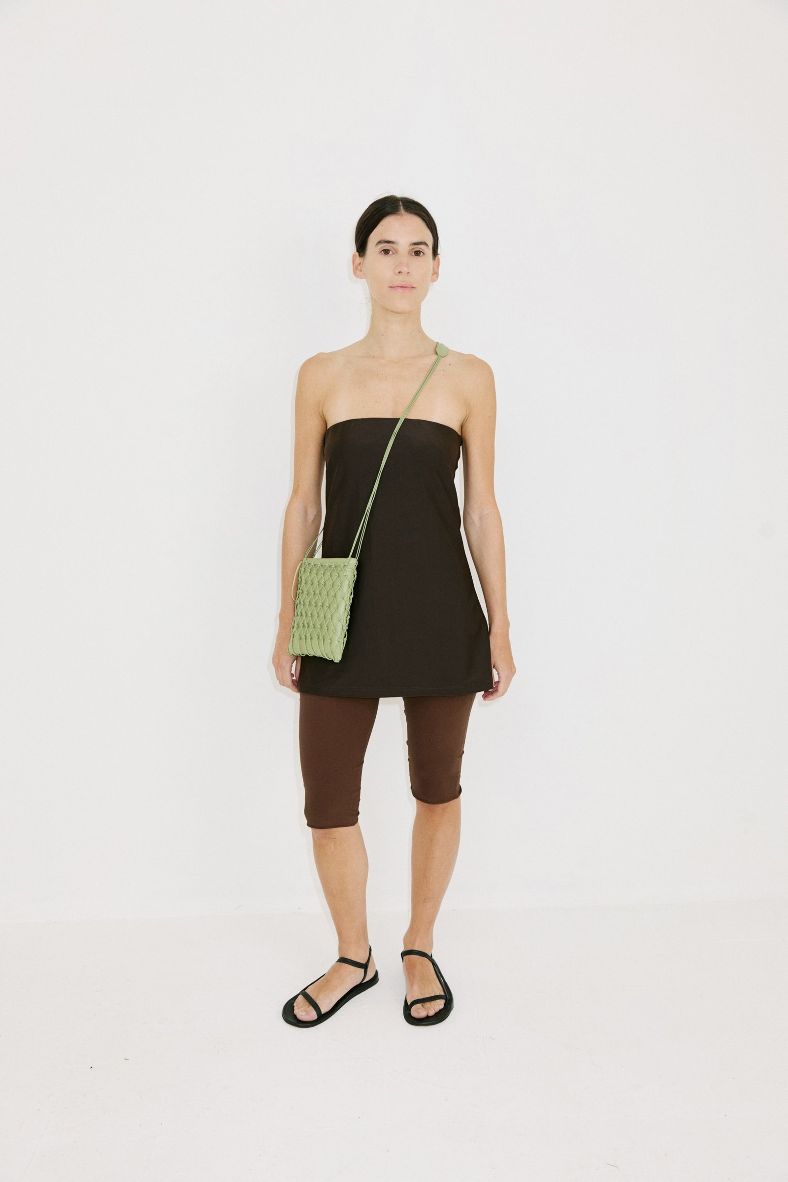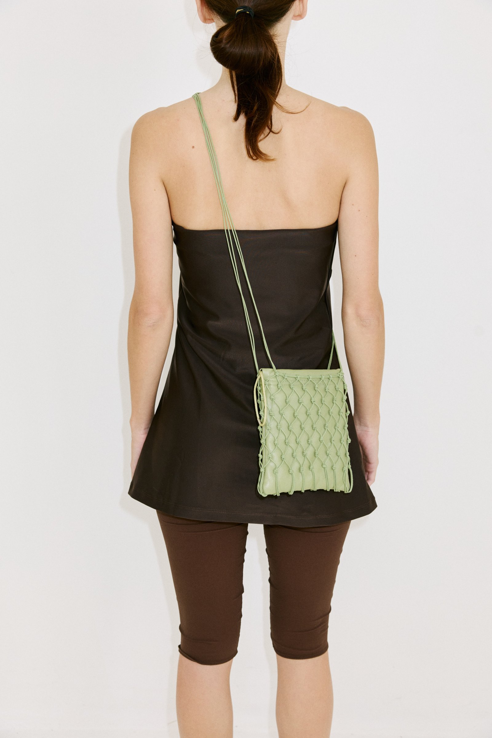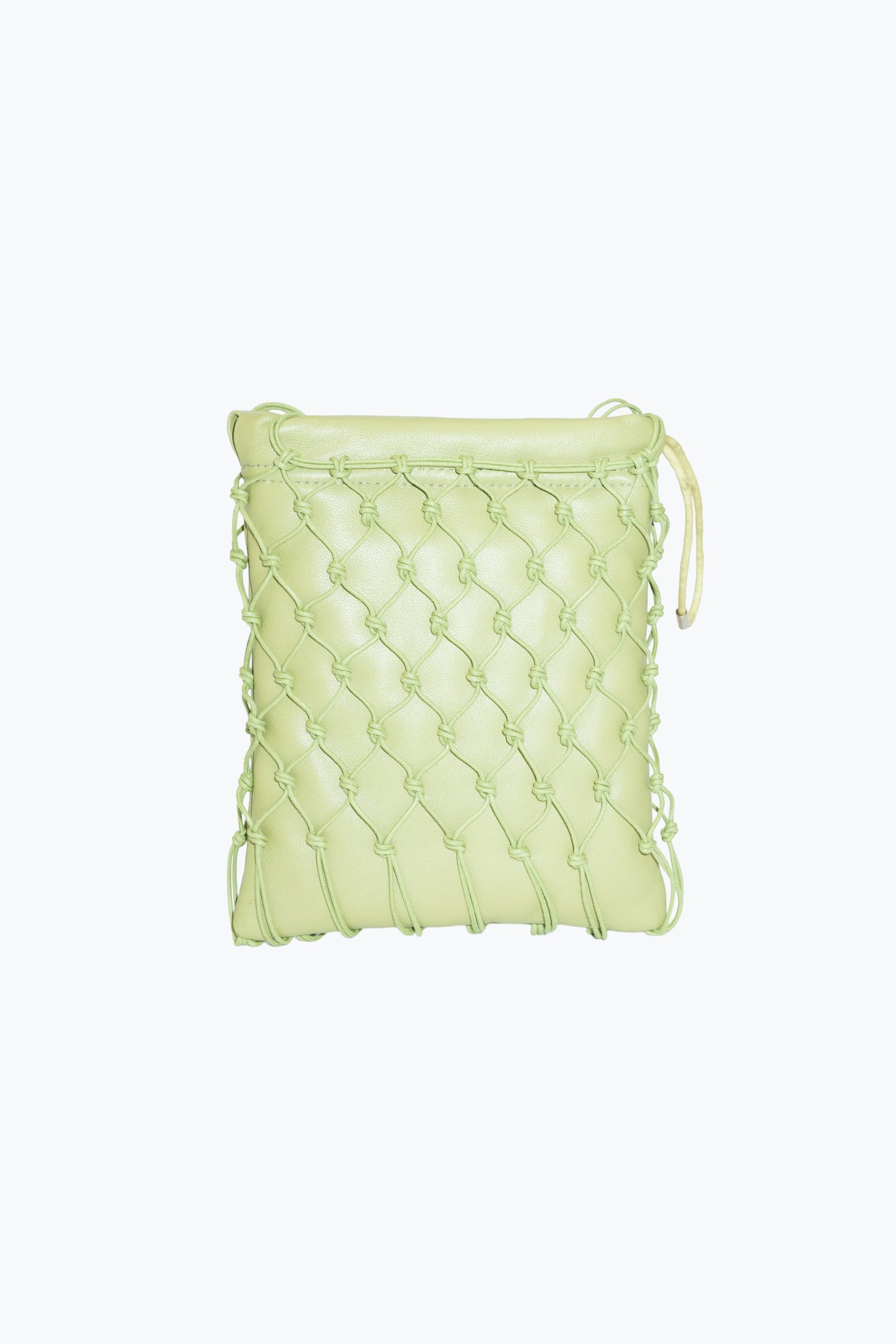 Carterita trenzada a mano con hilo de algodón encerado y sobre interno de cuero de oveja. Cierra con frunce, tiene forrería de algodón y bolsillo interno.
