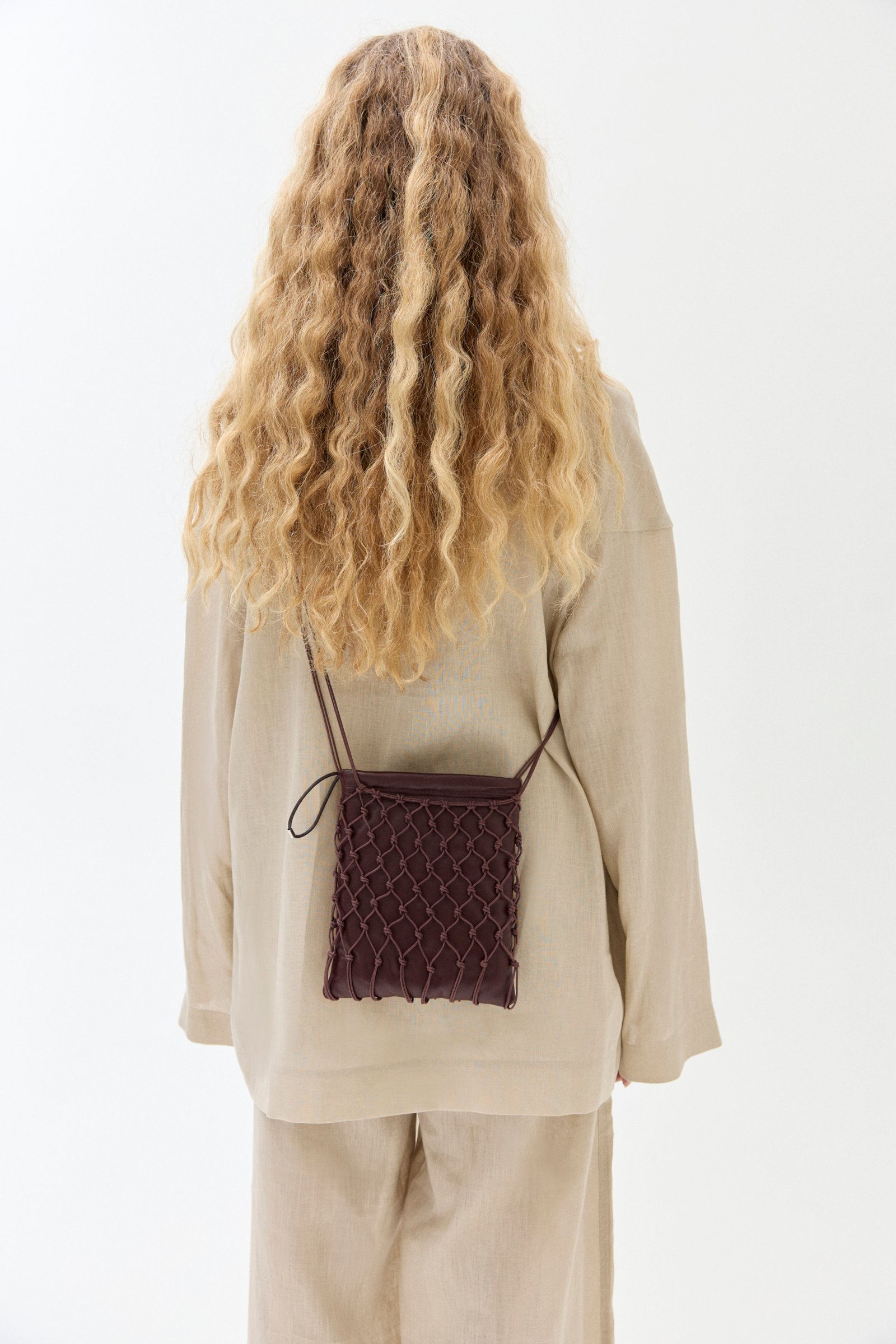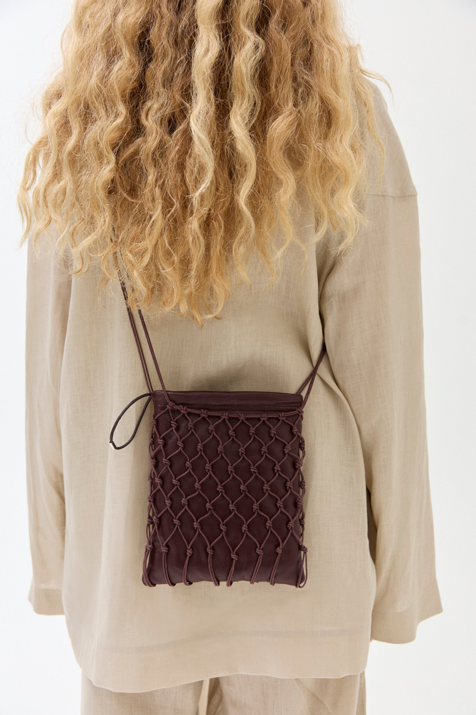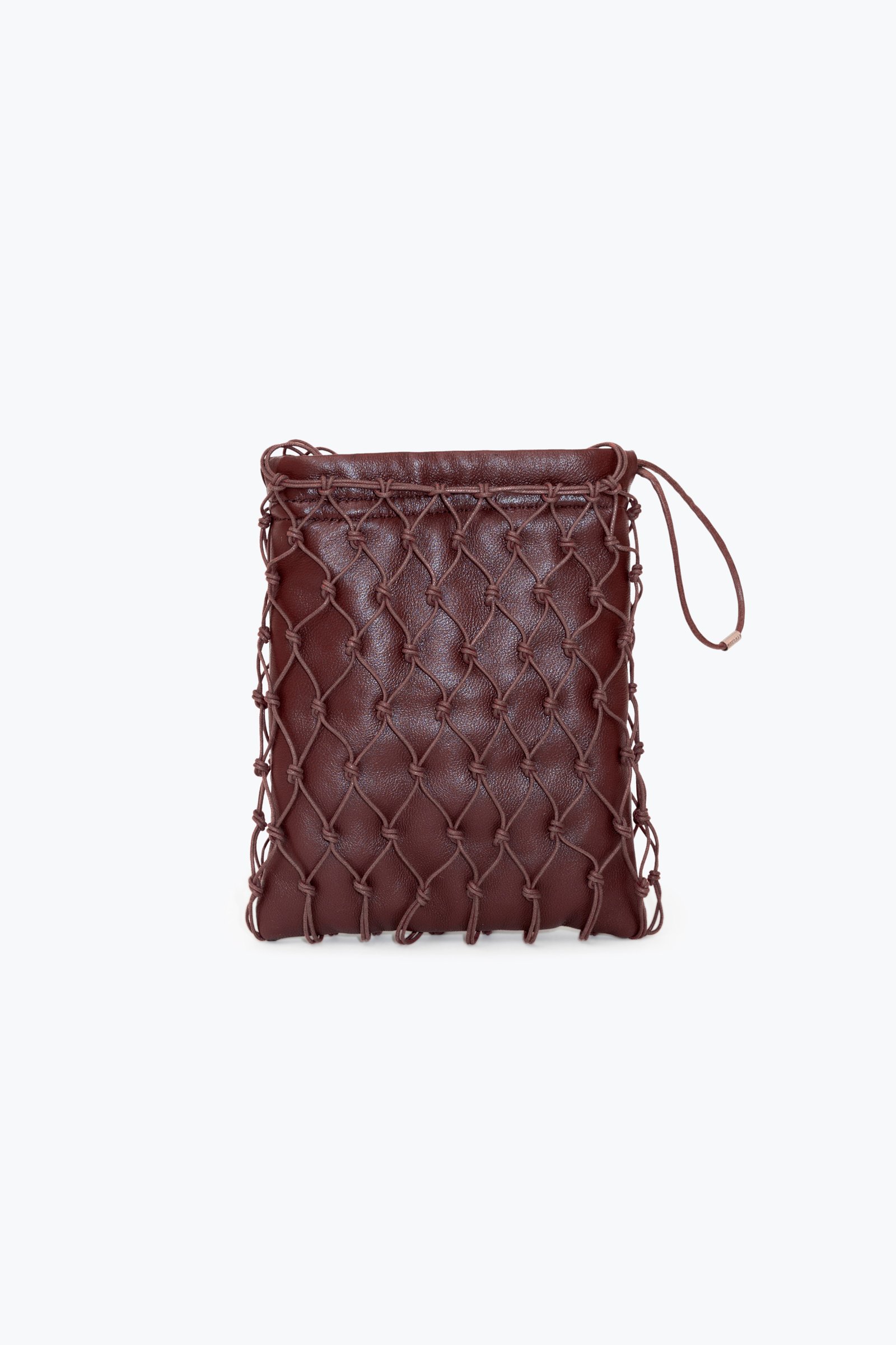 Carterita trenzada a mano con hilo de algodón encerado y sobre interno de cuero de oveja. Cierra con frunce, tiene forrería de algodón y bolsillo interno.