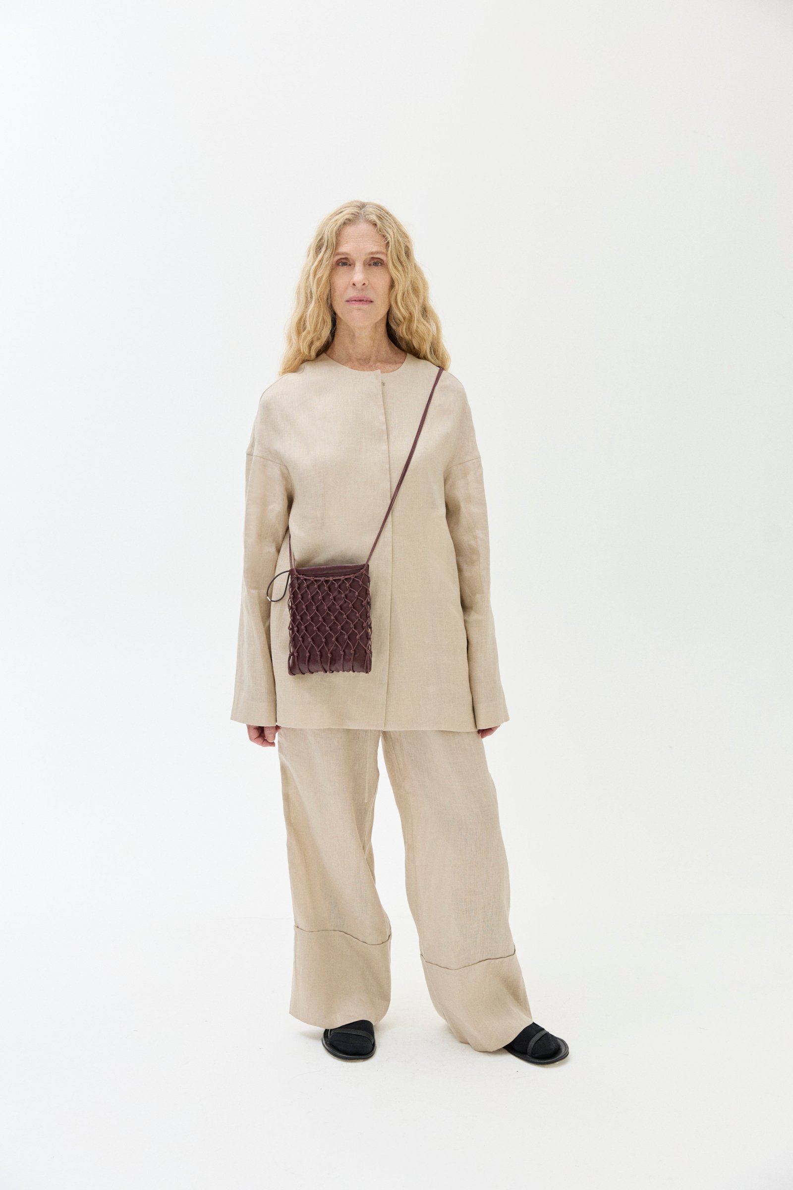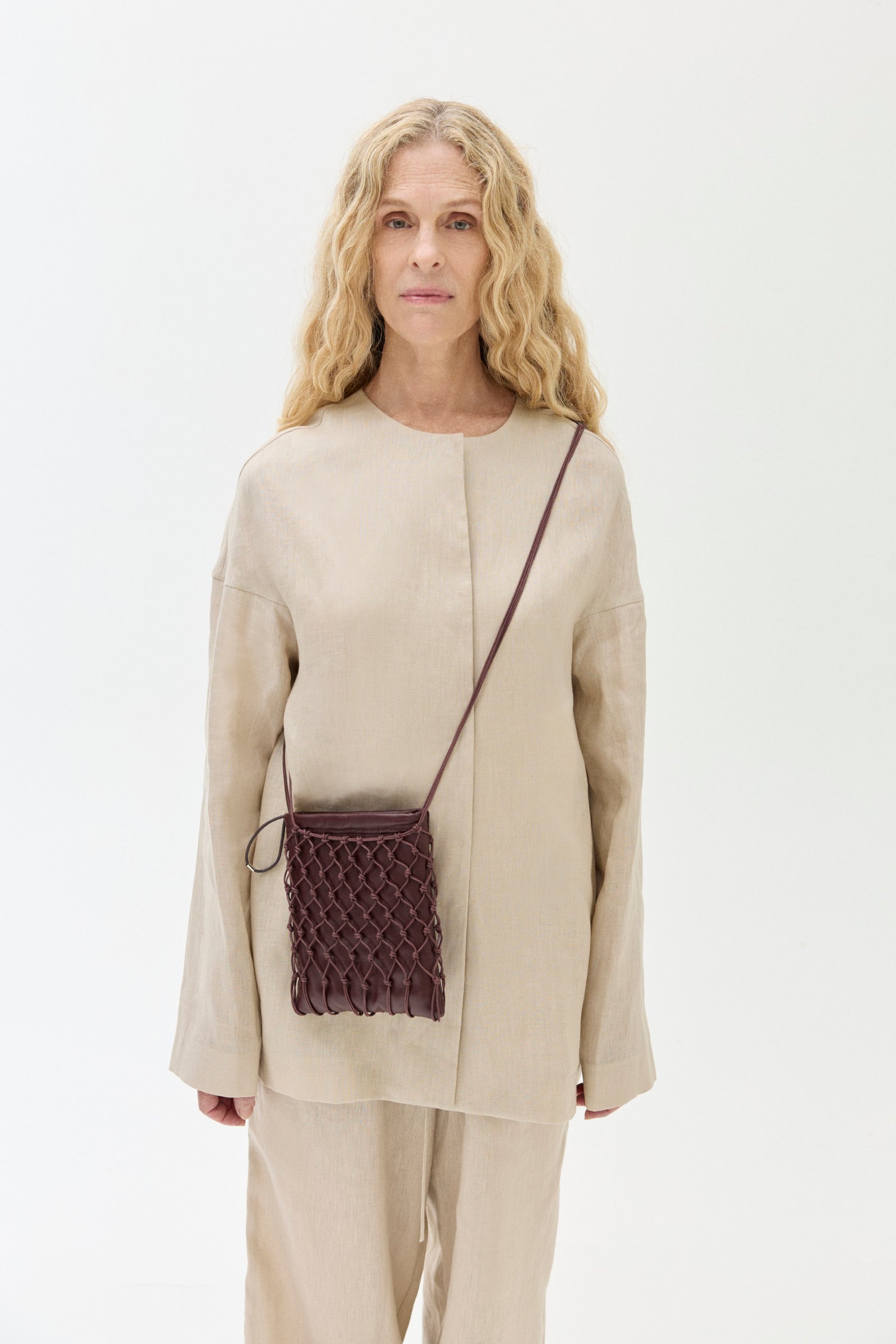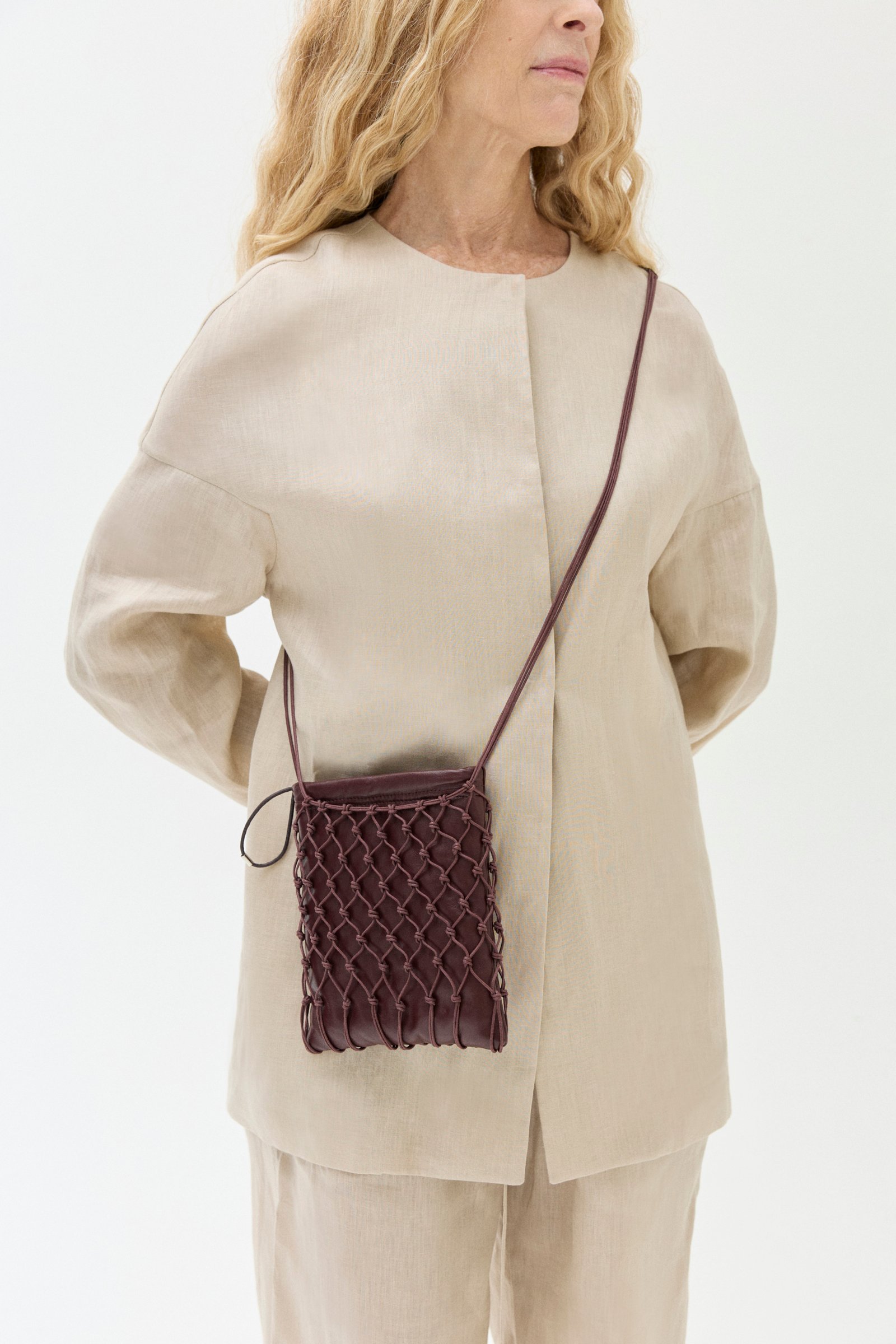 Carterita trenzada a mano con hilo de algodón encerado y sobre interno de cuero de oveja. Cierra con frunce, tiene forrería de algodón y bolsillo interno.