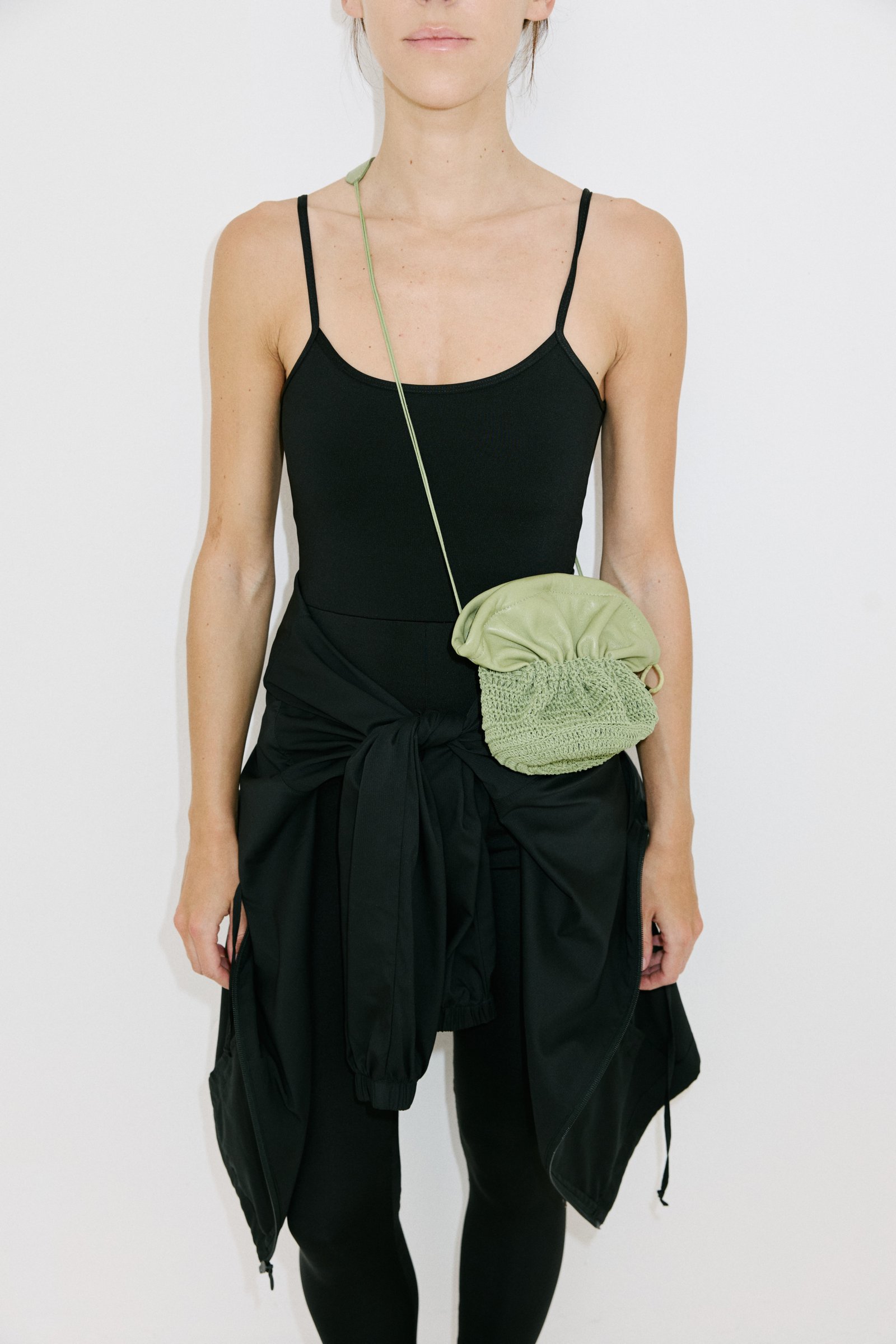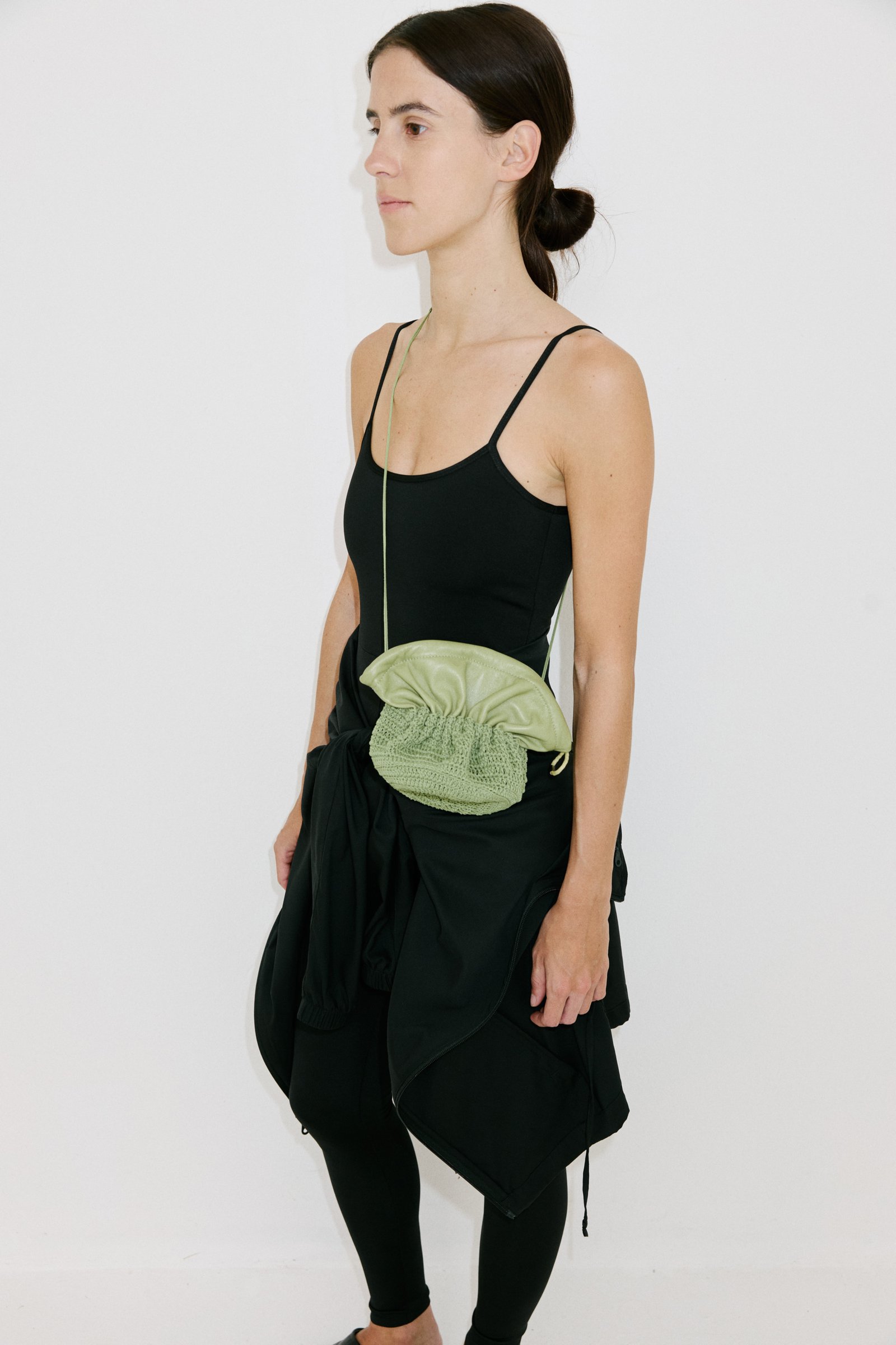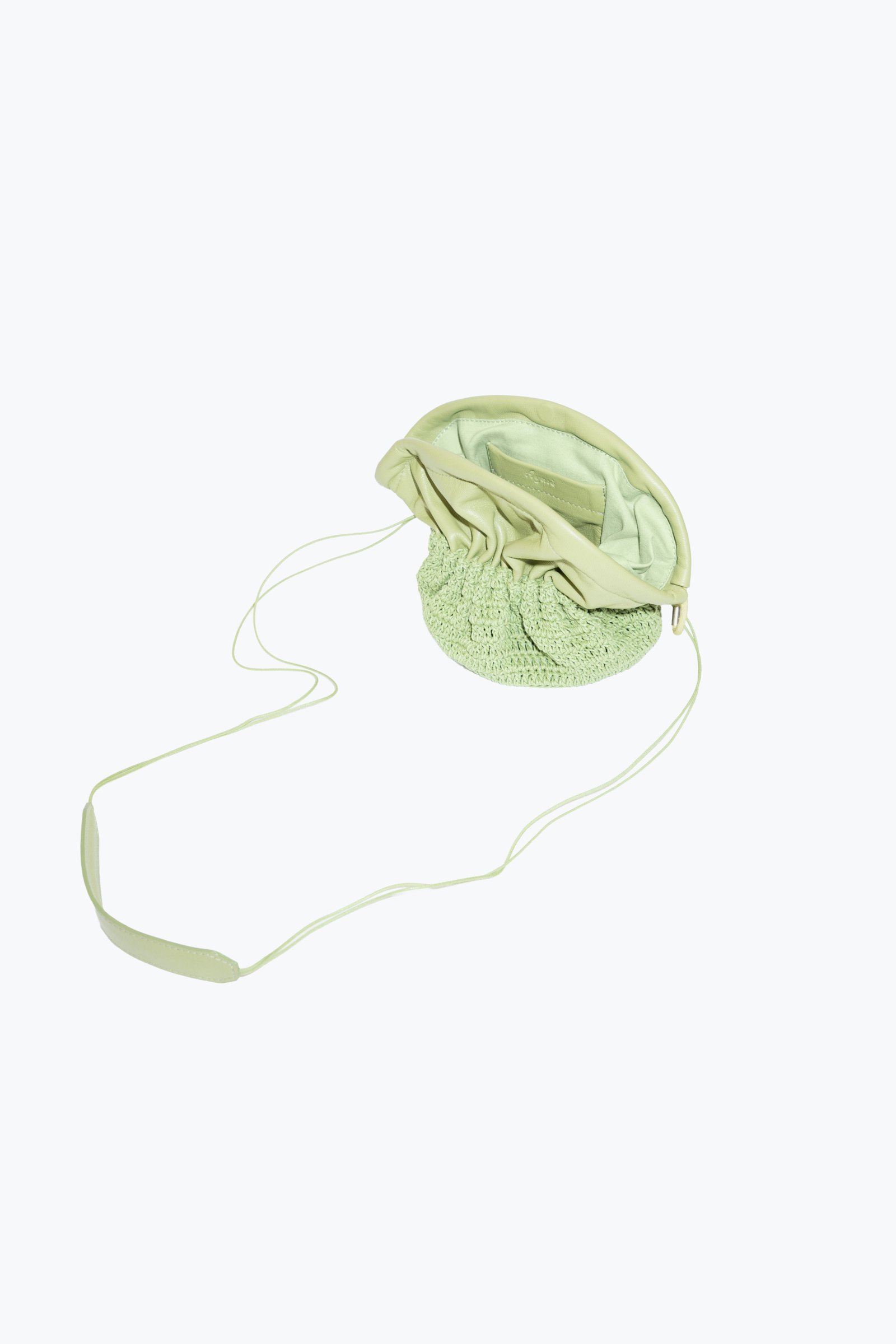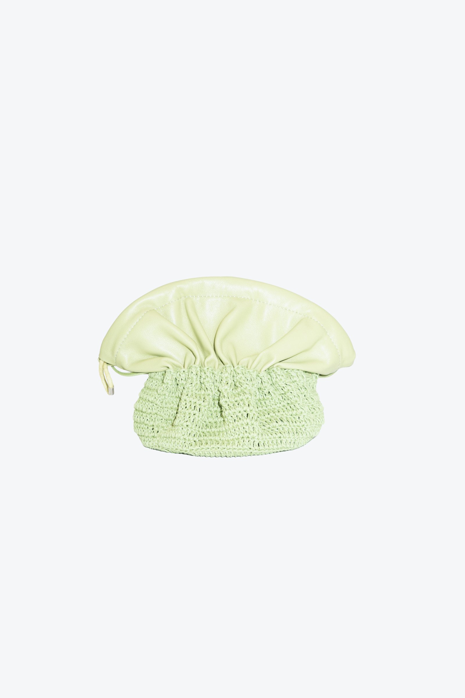 Carterita tejida a mano con hilo de algodón encerado y fuelle de cuero de oveja. Cierra con frunce y unos pequeños imanes. Tiene forrería de algodón y bolsillo interno.