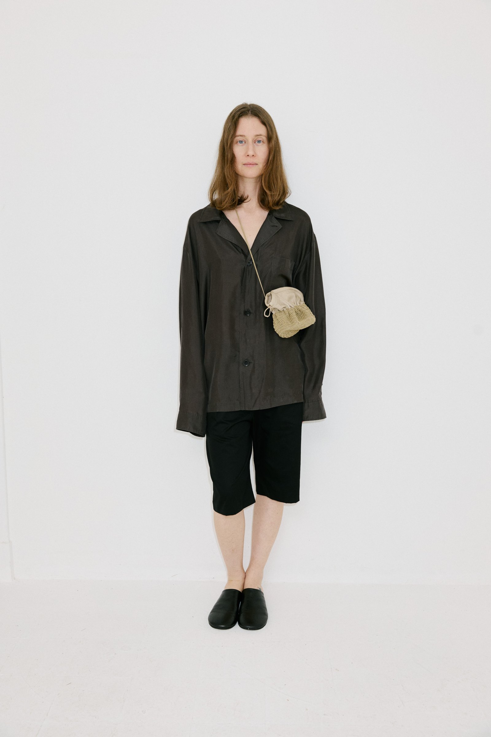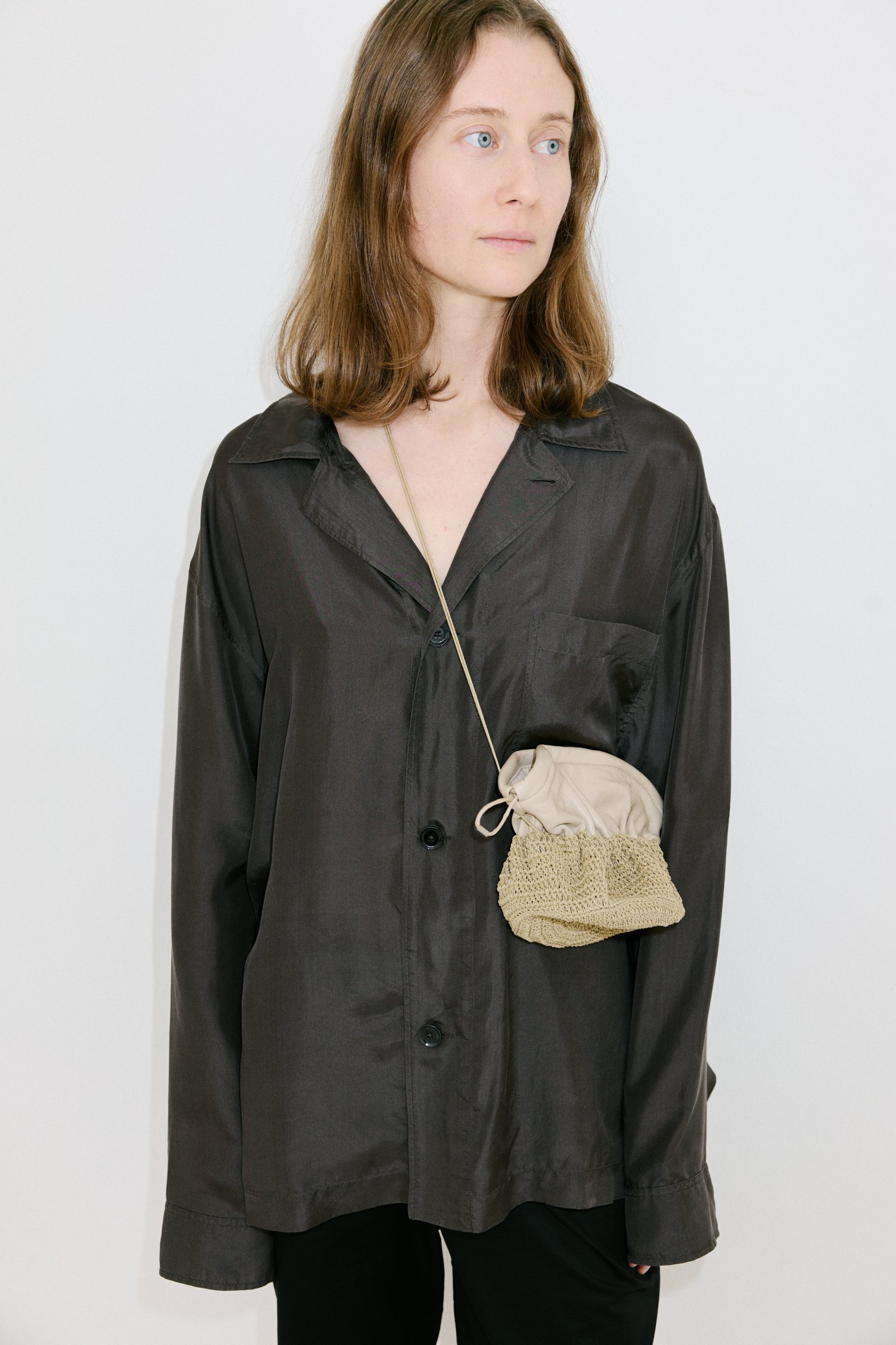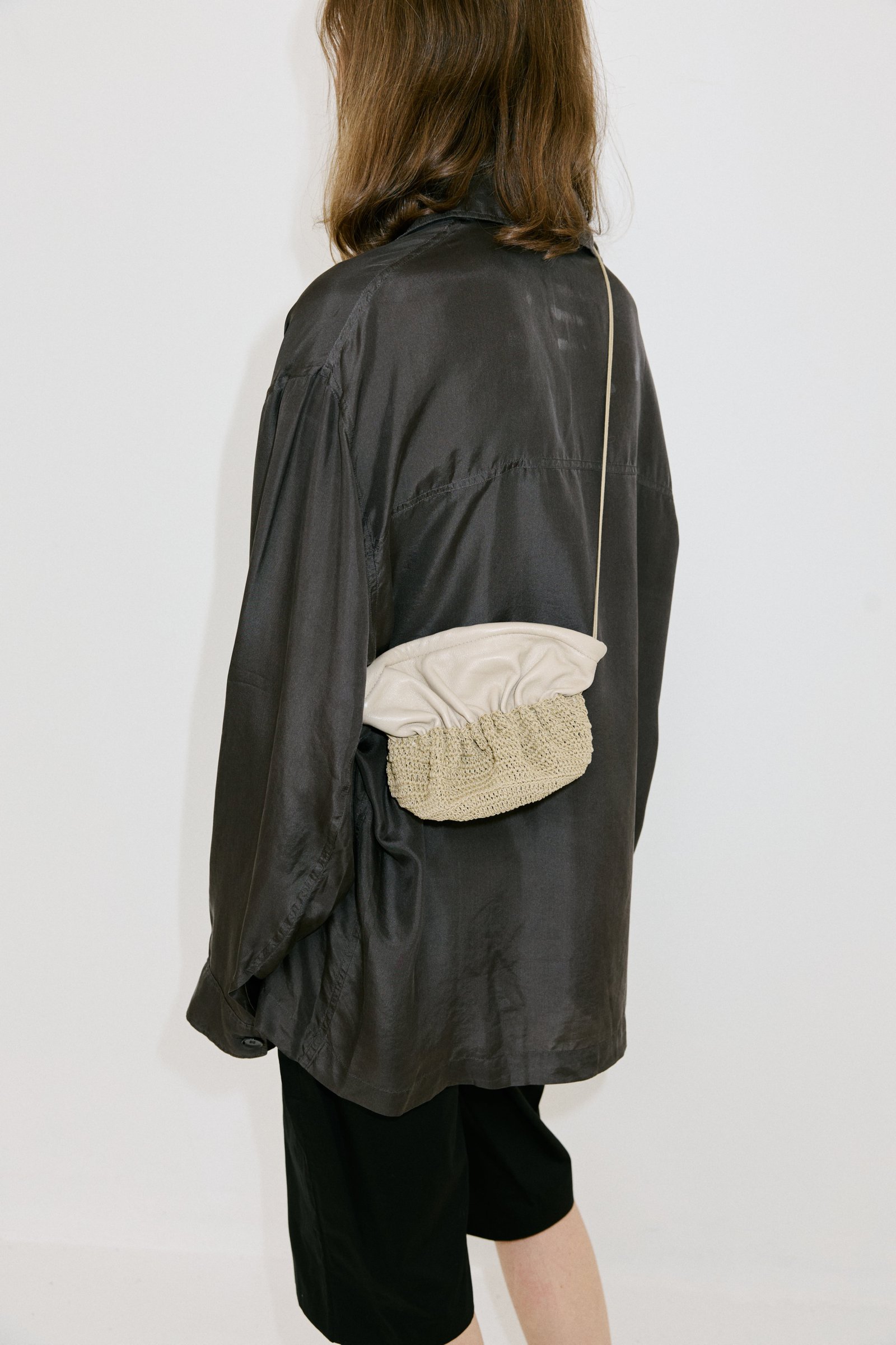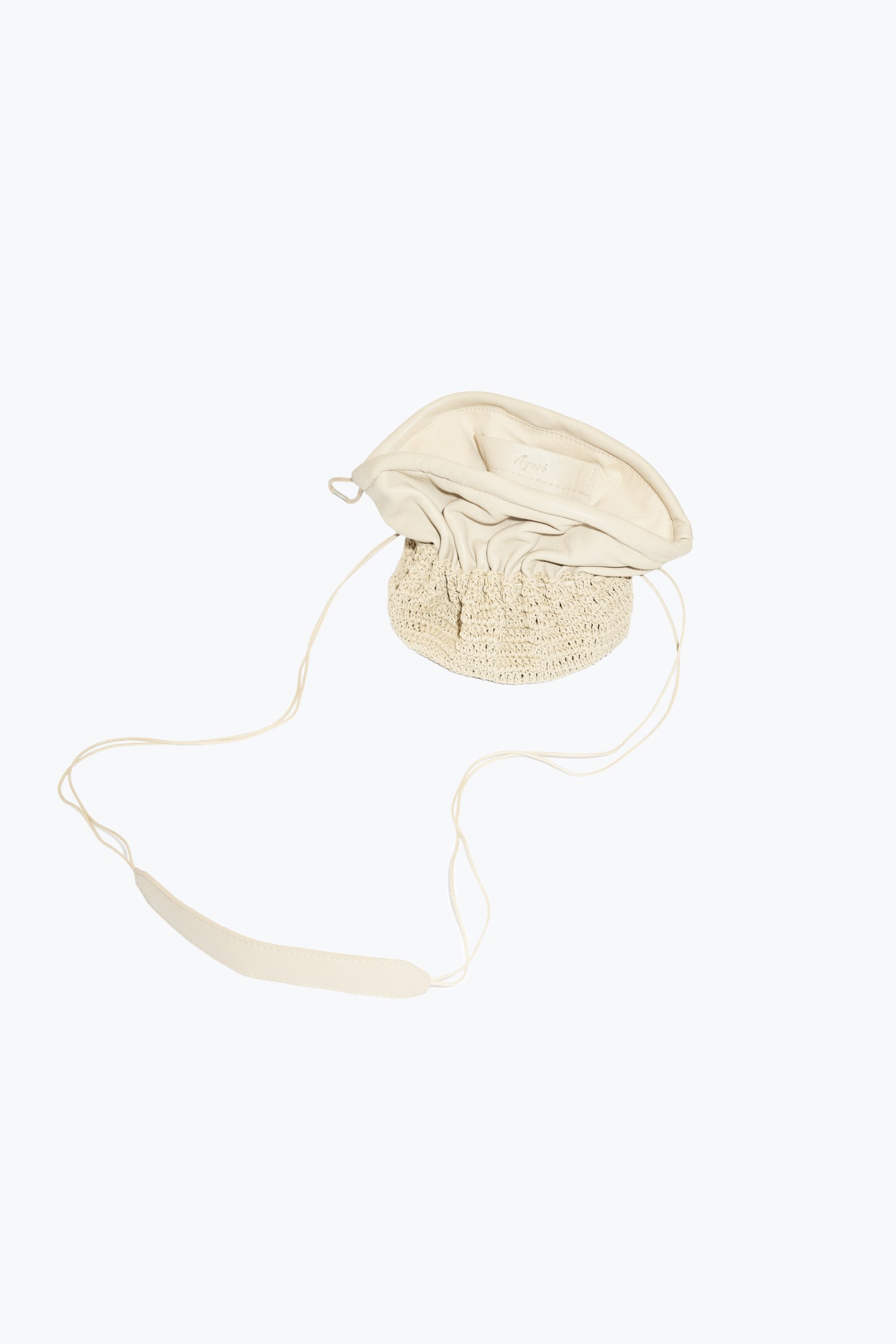 Carterita tejida a mano con hilo de algodón encerado y fuelle de cuero de oveja. Cierra con frunce y unos pequeños imanes. Tiene forrería de algodón y bolsillo interno.