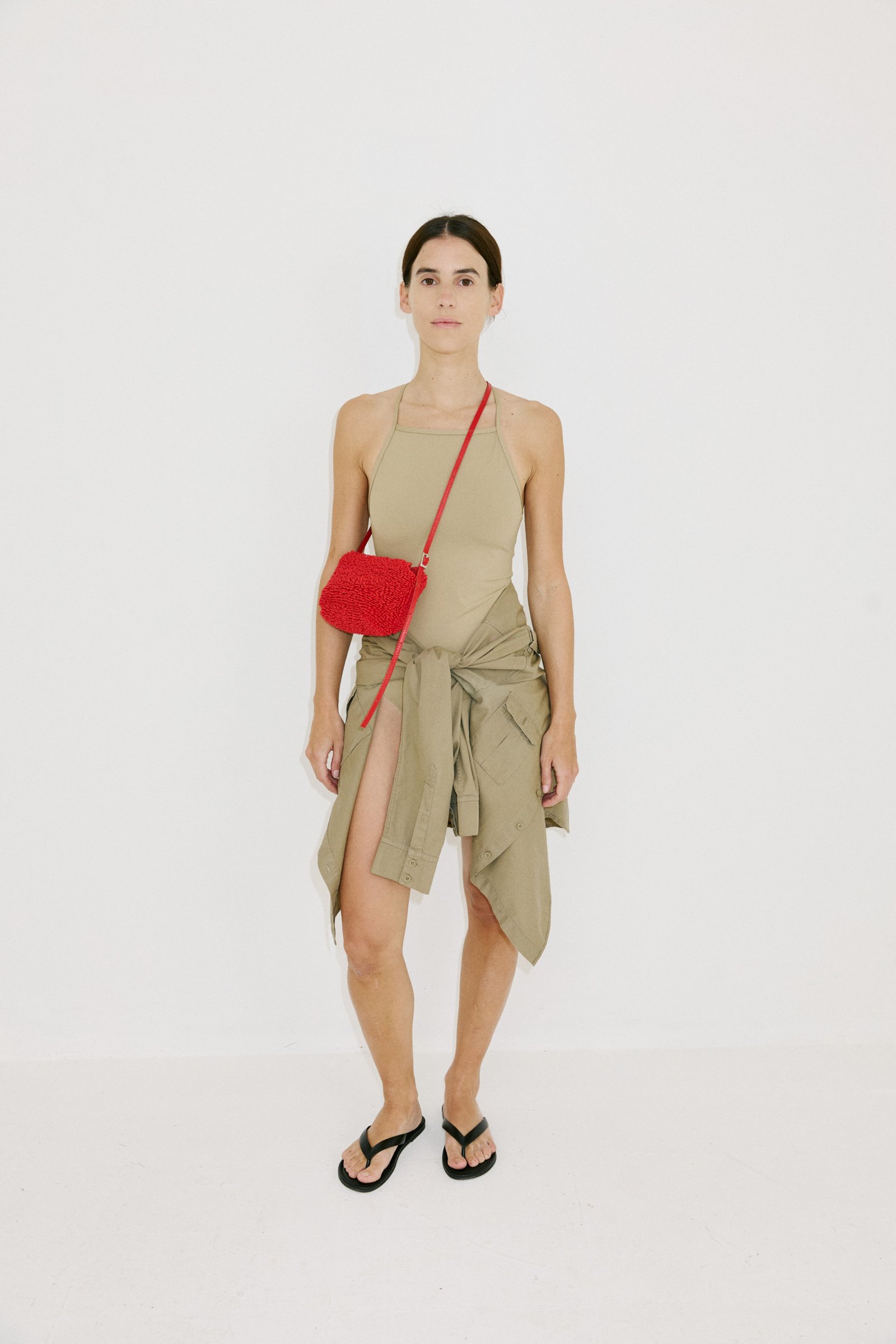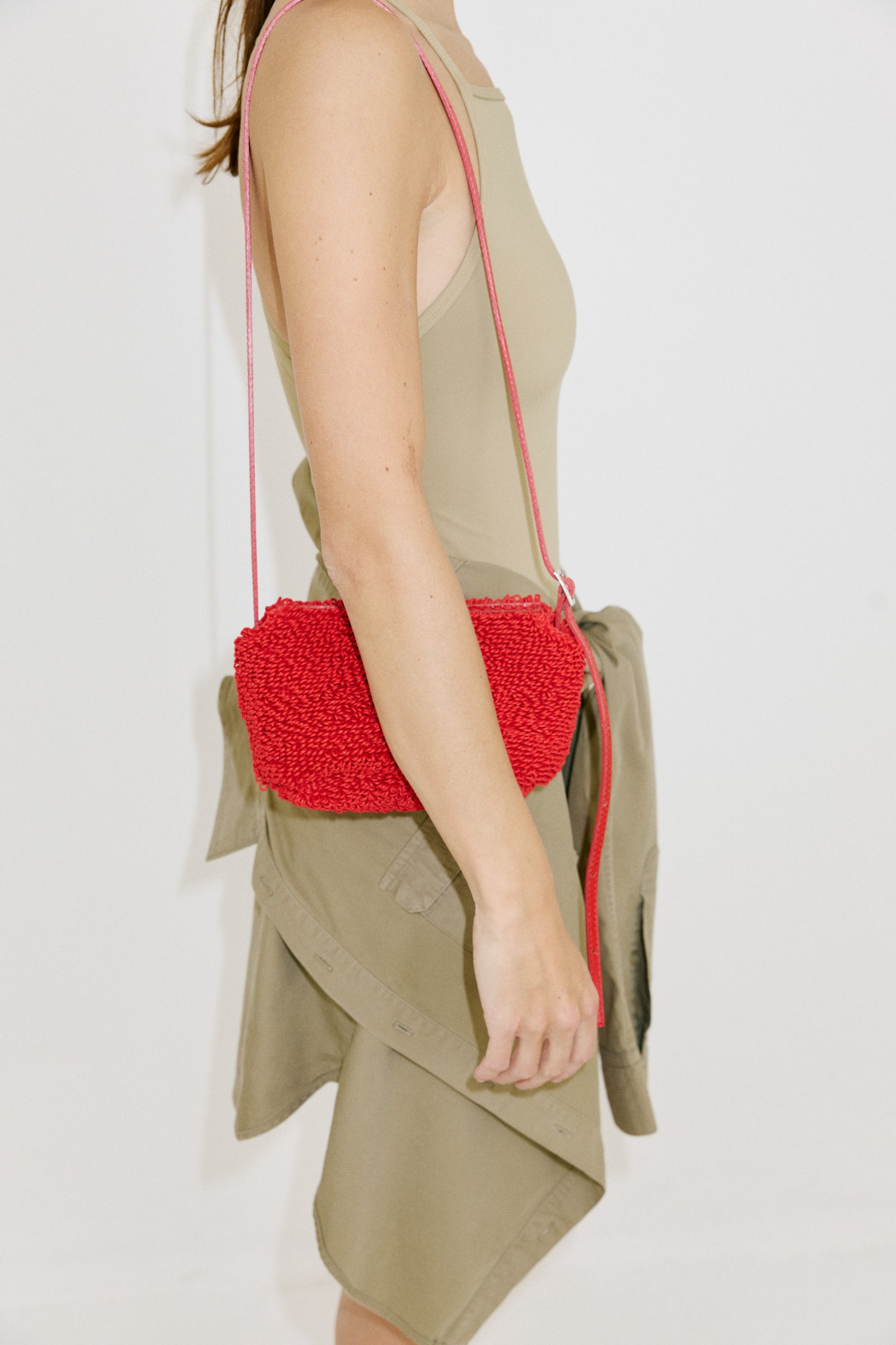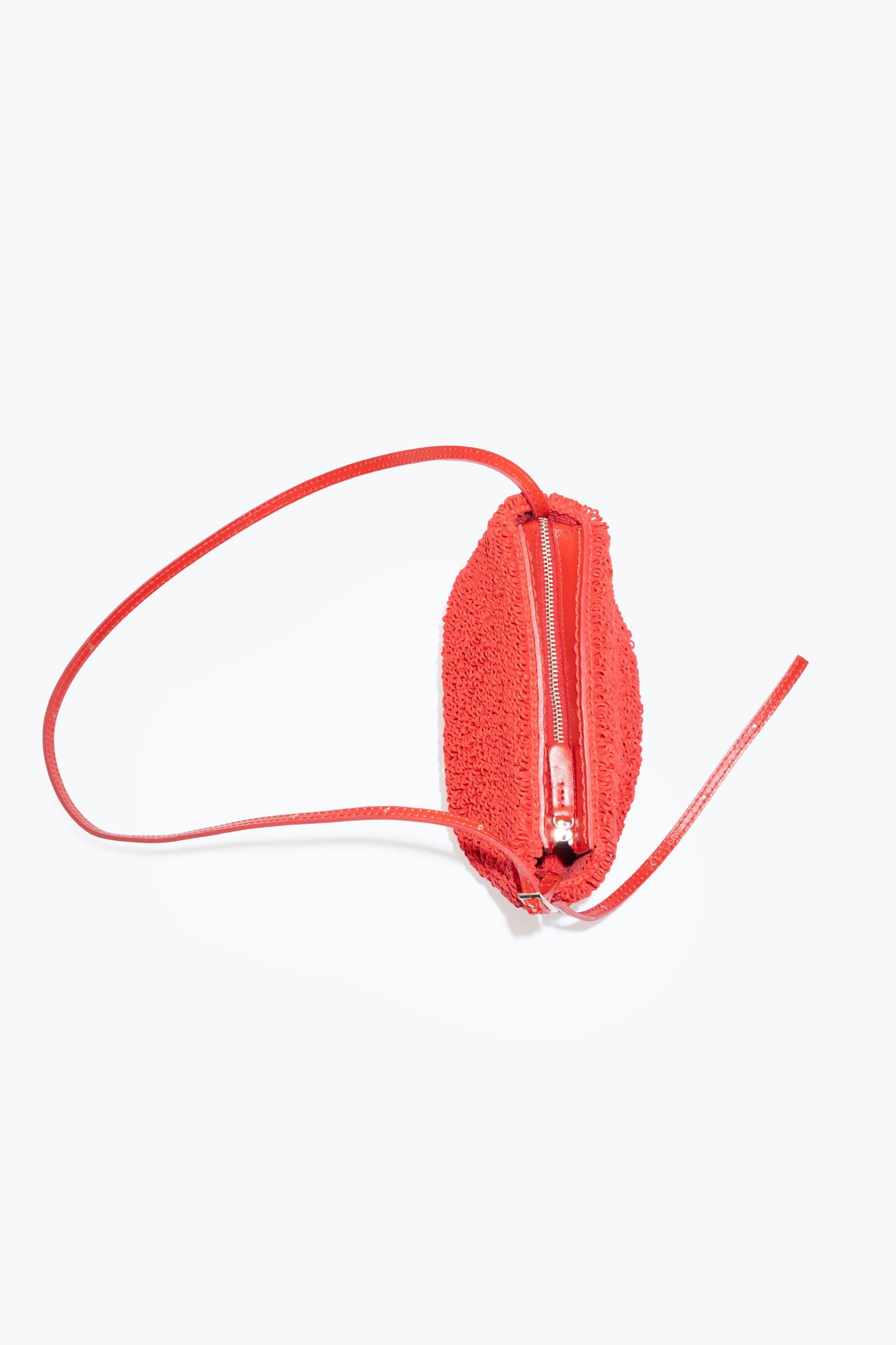 Carterita tejida a mano con hilo de algodón encerado y fuelle de cuero vacuno con cierre metálico. Tiene correa fina regulable de cuero vacuno con hebilla metálica.