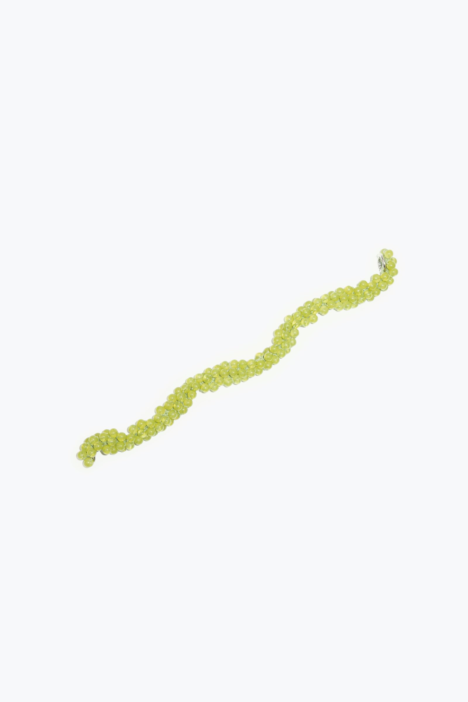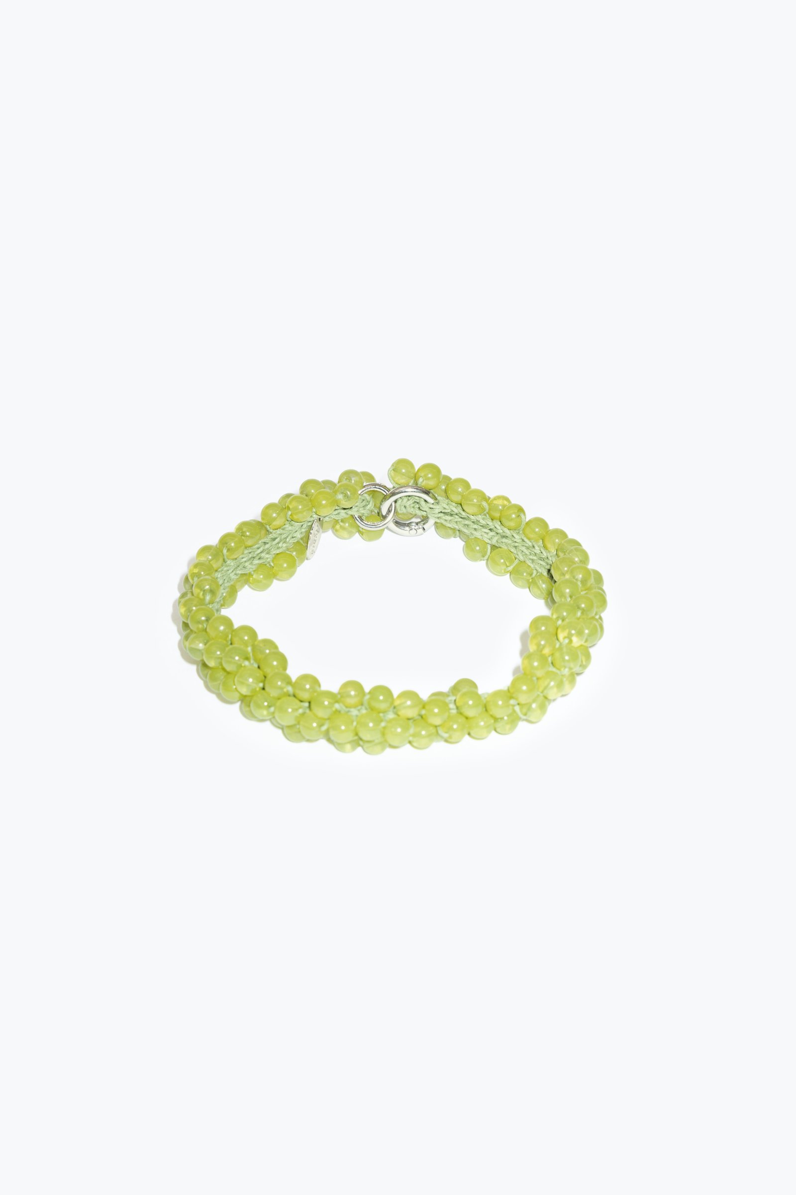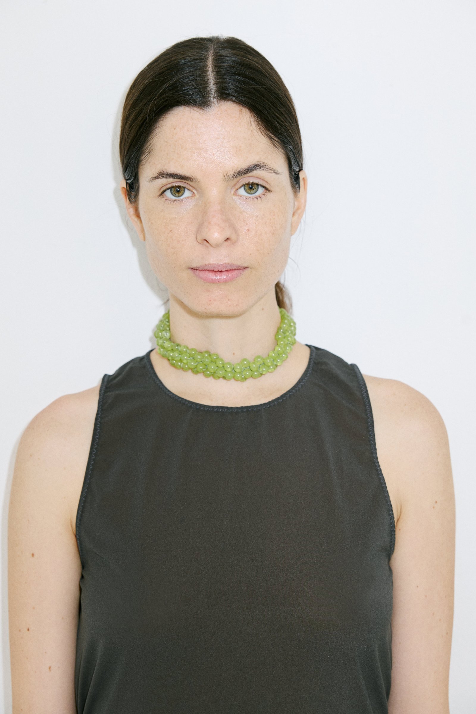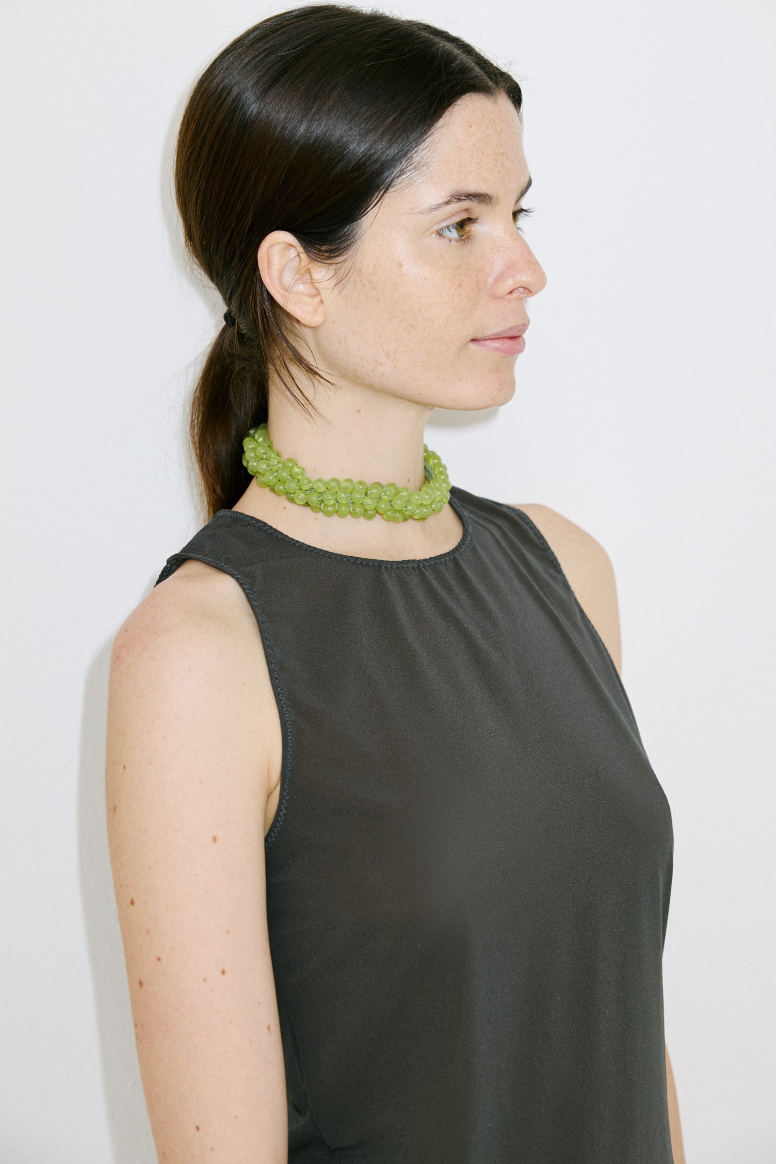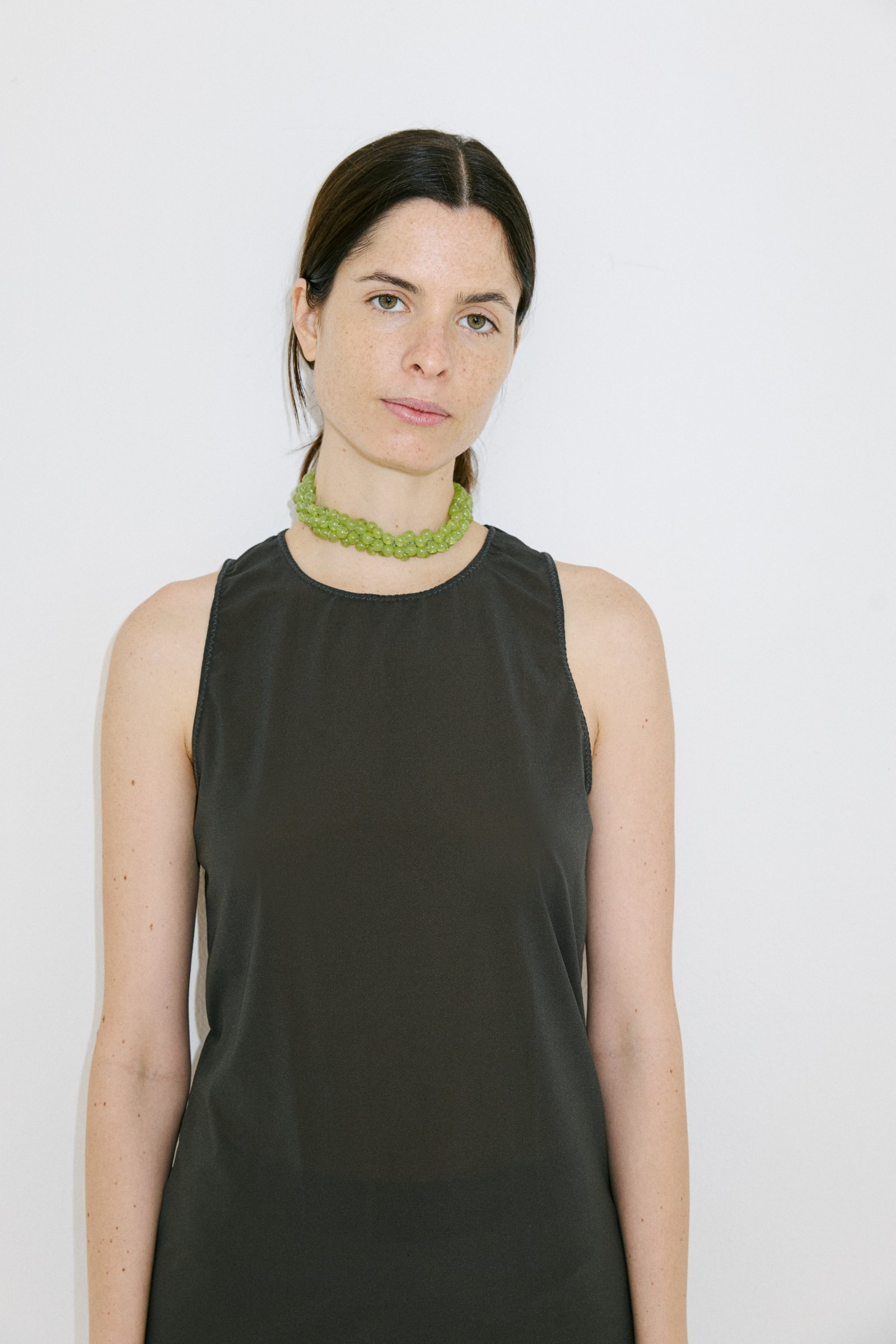 Gargantilla tejida a mano con hilo de algodón encerado y cuentas de vidrio. Cierra con mosquetón metálico.