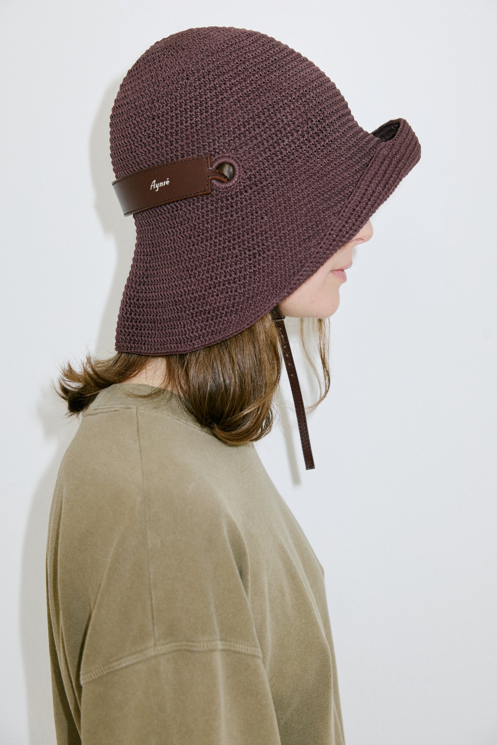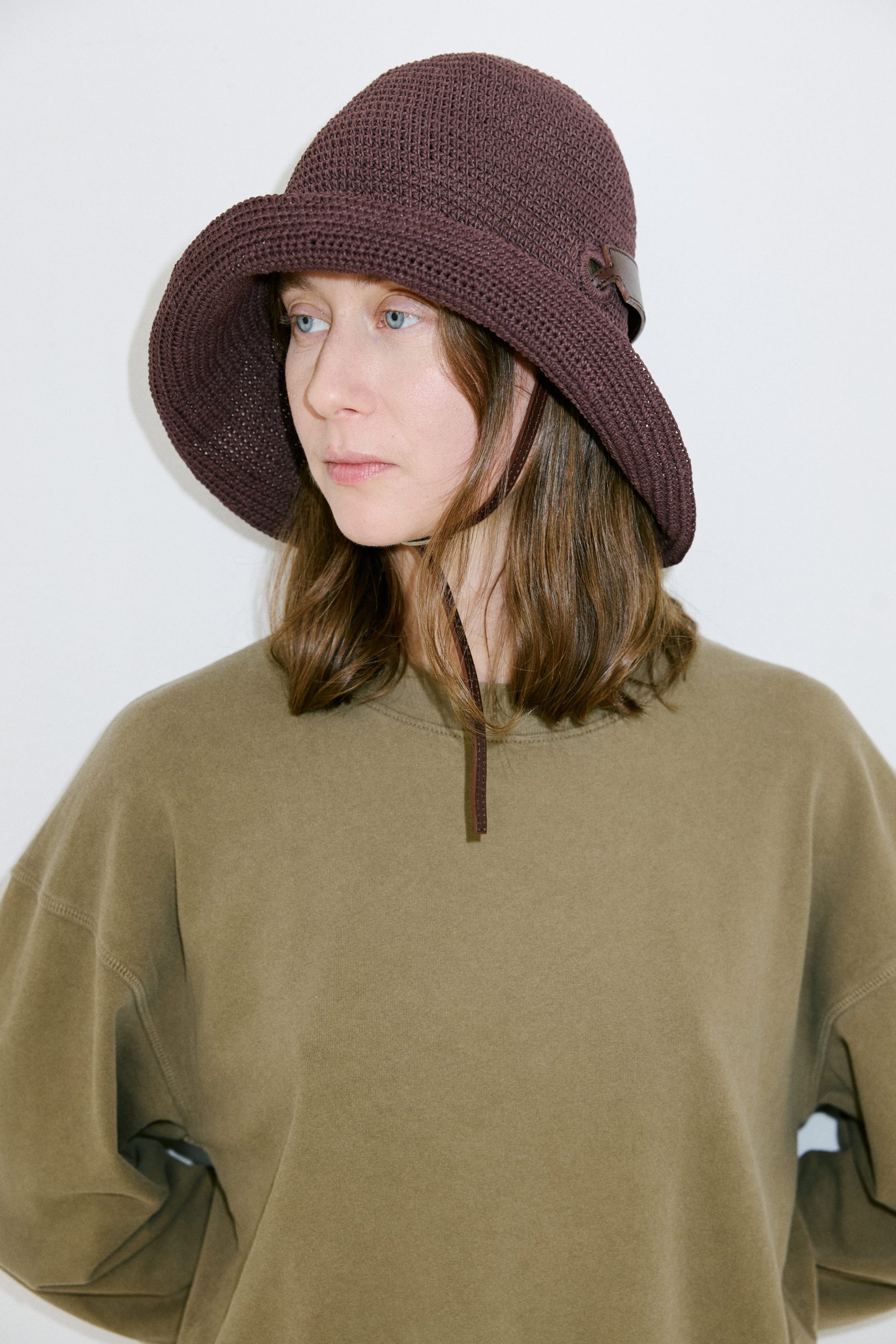 Sombrero tejido a mano con hilo de algodón encerado. Tiene un cinturón de cuero con hebilla metálica.